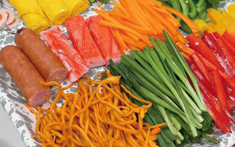Phần nhân bên trong mở rộng như một bản nhạc tùy hứng, gia đình thích ăn gì thì bạn cứ thoải mái điểm xuyết vào nấy. Từ những lát bò ba chỉ đỏ au mỏng tang, miếng trứng rán vàng ươm, thanh cua đậm vị biển, cho đến đậu bắp xanh giòn, cải thảo tím bào sợi mỏng, nấm đông cô, nấm hải sản, nấm đông trùng hạ thảo hay vài cọng hẹ, vài lát ớt chuông, cà rốt thái chỉ tươi rói.