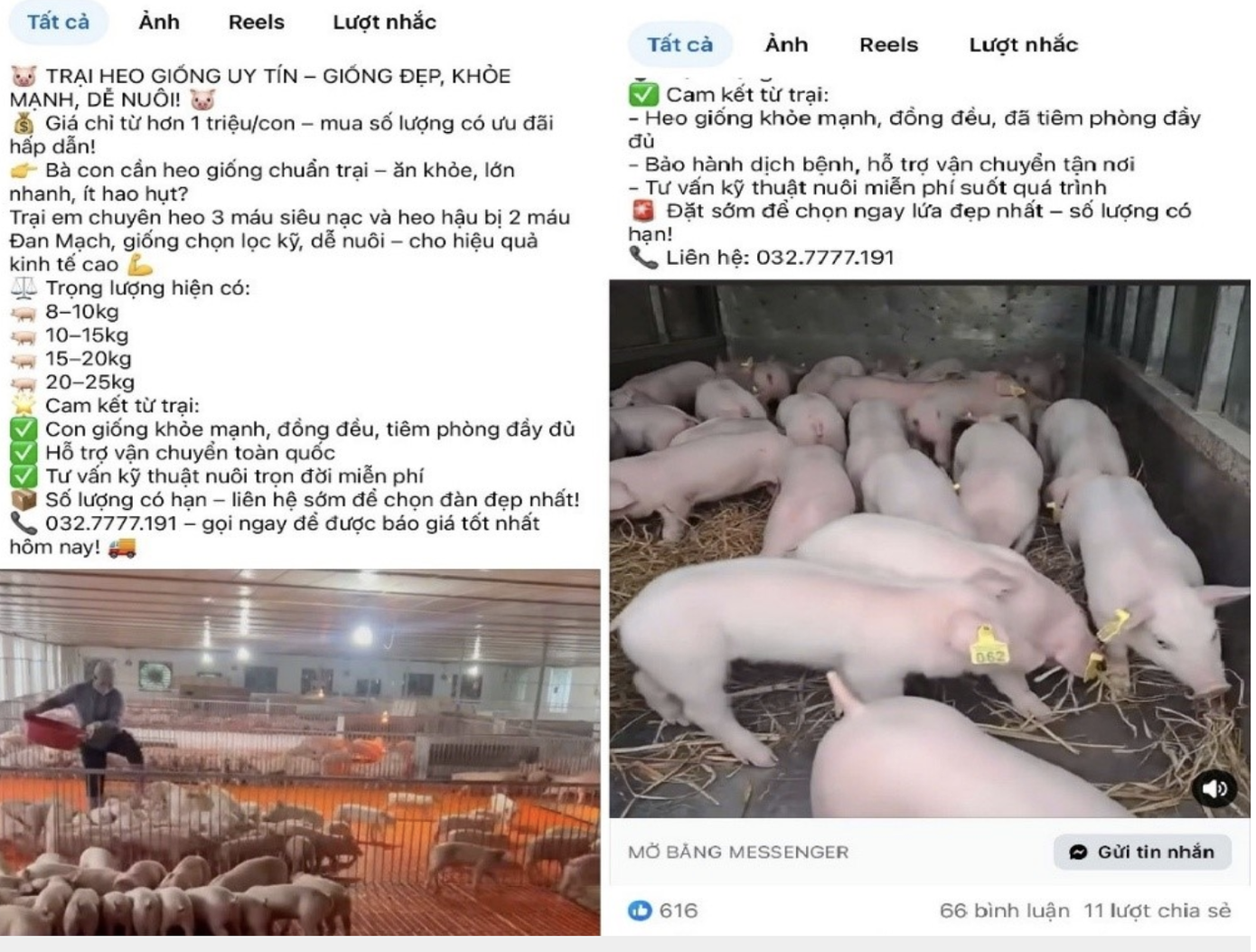 Điểm đáng chú ý là cả hai vụ việc đều có chung phương thức hoạt động: rao bán heo giống trên mạng xã hội Facebook với nhiều nội dung quảng cáo hấp dẫn như “heo giống khỏe mạnh, đồng đều, đã tiêm phòng đầy đủ”, “bảo hành dịch bệnh”, “hỗ trợ vận chuyển tận nơi”, “mua 10 con tặng 1 con”, hay “tư vấn kỹ thuật chăn nuôi miễn phí”.