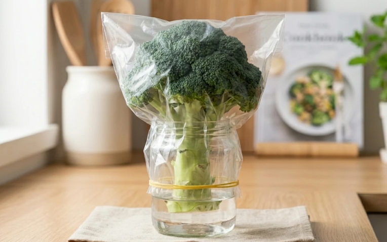 Cắt bỏ khoảng 1-2 cm phần gốc cuống, sau đó cắm cả bông súp lơ vào một chiếc cốc thủy tinh có chứa ít nước (phần cuống ngập trong nước). Dùng túi nilon trùm kín phần hoa bên trên và dùng chun buộc lại. Cách này giúp hoa không bị mất nước, giữ được độ tươi mướt lên đến một tuần.