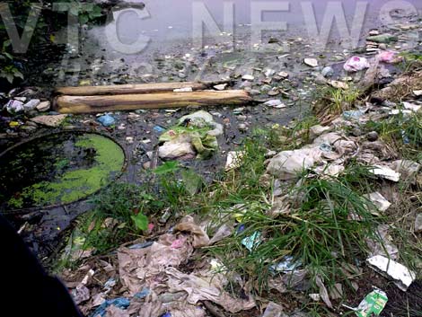 Đáng chú ý hơn là các công đoạn làm ruốc được diễn ra ngay cạnh ao rác thải. Dưới ao là bồng bềnh đủ mọi thứ rác hôi thối từ nhiều nguồn nước thải tập kết về đây. Nước vẩn màu đen ngòm, đặc sệt cùng mùi hôi tanh bay lên nồng nặc. Cách đó không xa, những khay ruốc được phơi giữa lối đi.