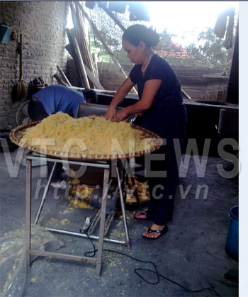 Theo chỉ dẫn của dân làng, chúng tôi tìm đến một cơ sở sản xuất ruốc gà nằm ở gần đê, sâu hun hút trong ngõ nhỏ. Mỗi ngày cơ sở này sản xuất ra cả tấn ruốc gà các loại, được coi là nơi cung ứng lượng lớn ruốc ra thị trường Hà Nội.