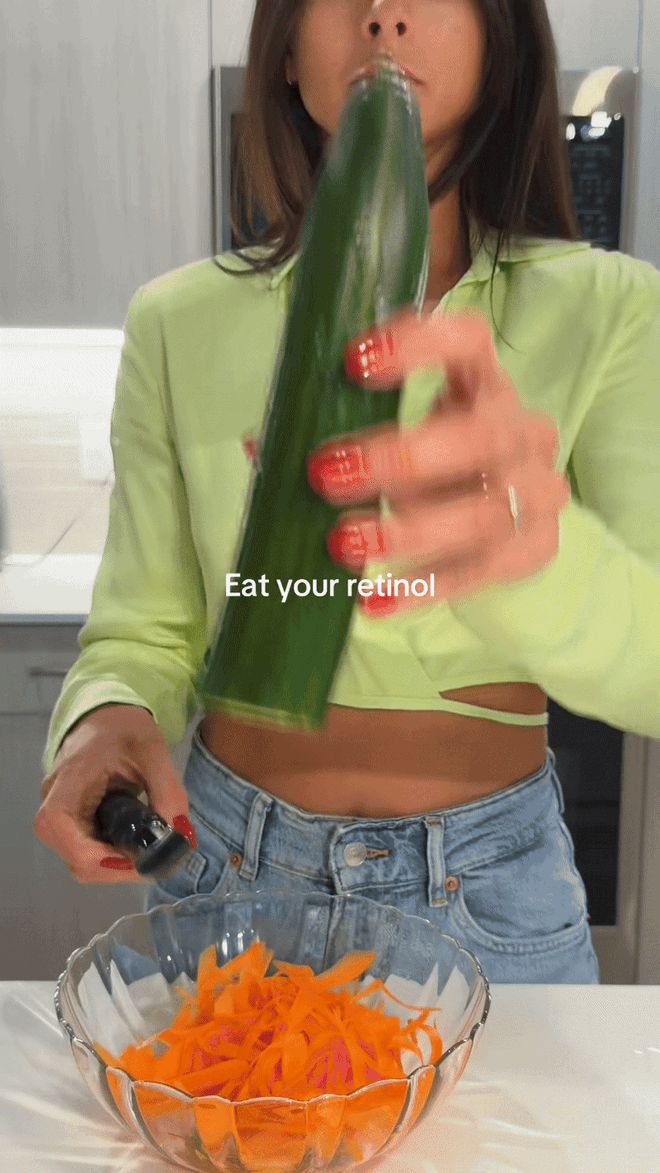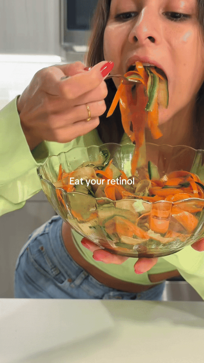 Gọi là "salad retinol" bởi món ăn tận dụng nguồn vitamin A tự nhiên từ thực phẩm, đặc biệt là beta-carotene trong cà rốt. Khi được hấp thu, dưỡng chất này chuyển hóa thành dạng hoạt động giúp hỗ trợ tái tạo tế bào da, cải thiện tình trạng xỉn màu sau thời gian thức khuya và ăn nhiều dầu mỡ, đồng thời góp phần hạn chế mụn do thực phẩm nếp hoặc đường. Kết hợp với chất béo tốt từ bơ và lượng nước dồi dào trong dưa chuột, món ăn hoạt động như một dạng "skincare từ bên trong", phù hợp giai đoạn cơ thể cần trở lại nhịp sinh hoạt bình thường.