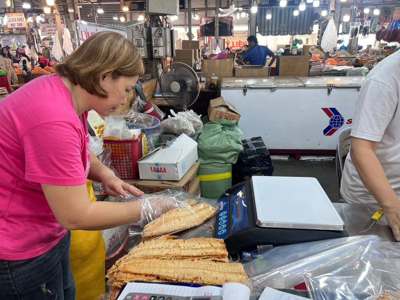 Ngày 7/2, thủ phủ đồ khô tại chợ đầu mối Bình Điền (phường Bình Đông, TPHCM) luôn tất bật từ sáng sớm đến chiều tối. Đây là chợ chuyên bán sỉ nhưng khách vẫn có thể mua lẻ từ một ký trở lên với giá sỉ. "Mỗi năm cứ đến gần Tết, tôi lại đến chợ đồ khô Bình Điền mua các loại tôm khô, cá khô, mực khô... làm quà biếu tặng cho người thân, bạn bè và gửi đi nước ngoài cho người nhà. Khô ở đây tươi ngon, đậm vị và có giá rất phải chăng" - chị Xuân Hoa (ngụ phường Sài Gòn) cho biết.