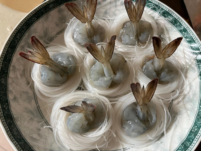 Bước quan trọng để làm cho tôm "nở" là đây: Đặt tôm nằm phẳng, dùng dao rạch dọc sống lưng, tạo một lỗ lớn xuyên bụng tôm, đảm bảo đuôi tôm có thể lọt qua lỗ. Loại bỏ chỉ đen của tôm. Sau đó luồn đuôi tôm qua lỗ và mở nó ra. và nhẹ nhàng kéo ra. Tôm sẽ lập tức "đứng thẳng" lên, giống như một nụ hoa sắp nở. Xếp từng con tôm đã "nở" lên từng phầm miến đã tạo thành vòng tròn, đuôi hướng ra ngoài, trông thật giống một bông hoa đang nở.