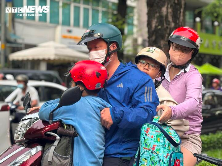 Nhiệt độ giảm mạnh, người dân TP.HCM co ro đi học, đi làm trong sáng sớm.