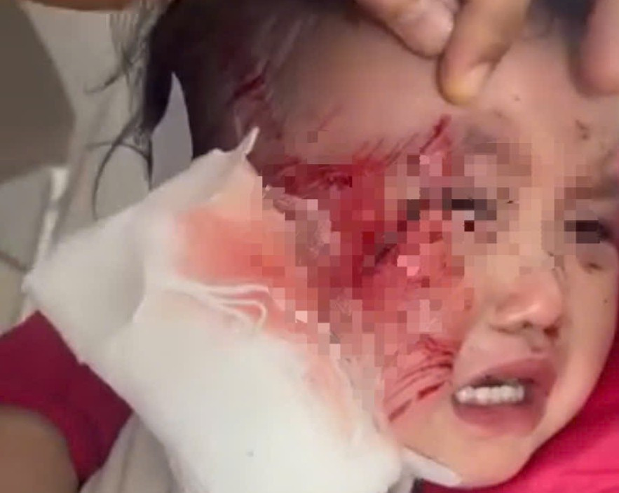 Gia đình cho biết, do cần thời gian theo dõi để đánh giá đầy đủ tổn thương não, cháu V. phải chờ nhiều giờ trước khi được can thiệp khâu vết thương. Cháu phải khâu 2 lớp với gần 30 mũi, các vết thương sâu, dài, tập trung ở vùng thái dương, má phải, mí mắt và sau tai.
