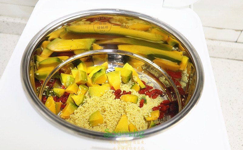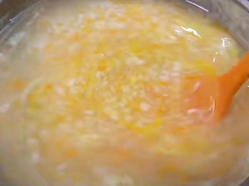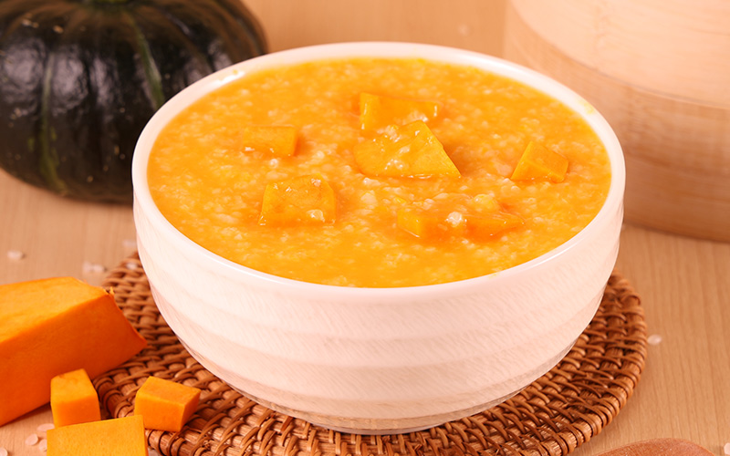 Cháo kê + Bí ngô già: Màu vàng óng ánh. Vị ngọt tự nhiên của bí ngô làm cho cháo thêm đậm đà và thơm ngon, đồng thời lượng pectin dồi dào cũng giúp bổ dưỡng cho dạ dày. Món ăn trông thật hấp dẫn và ấm áp.