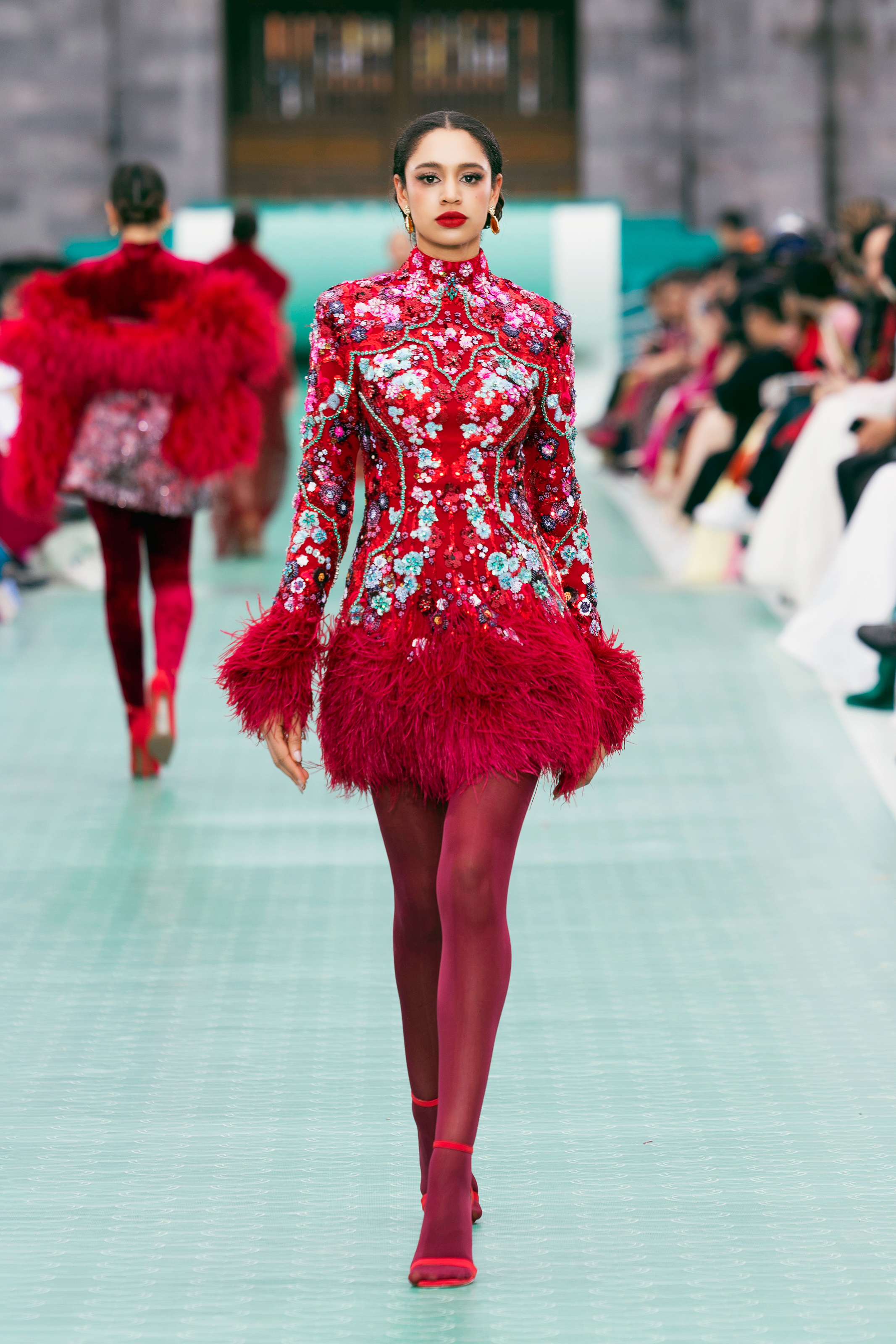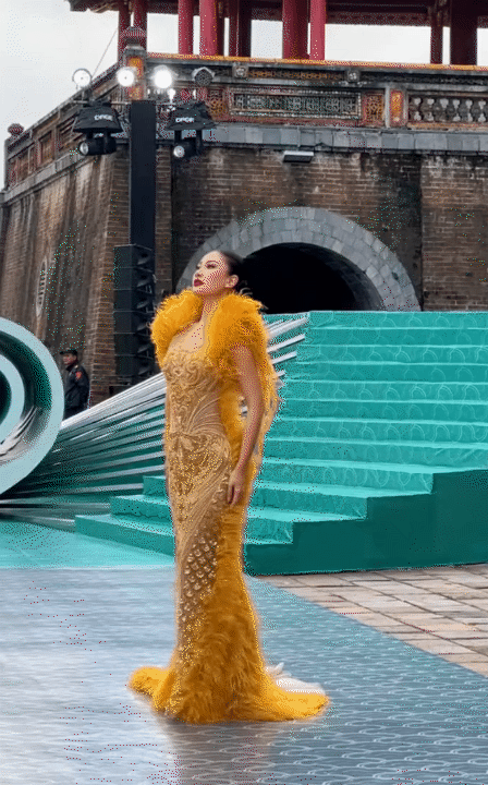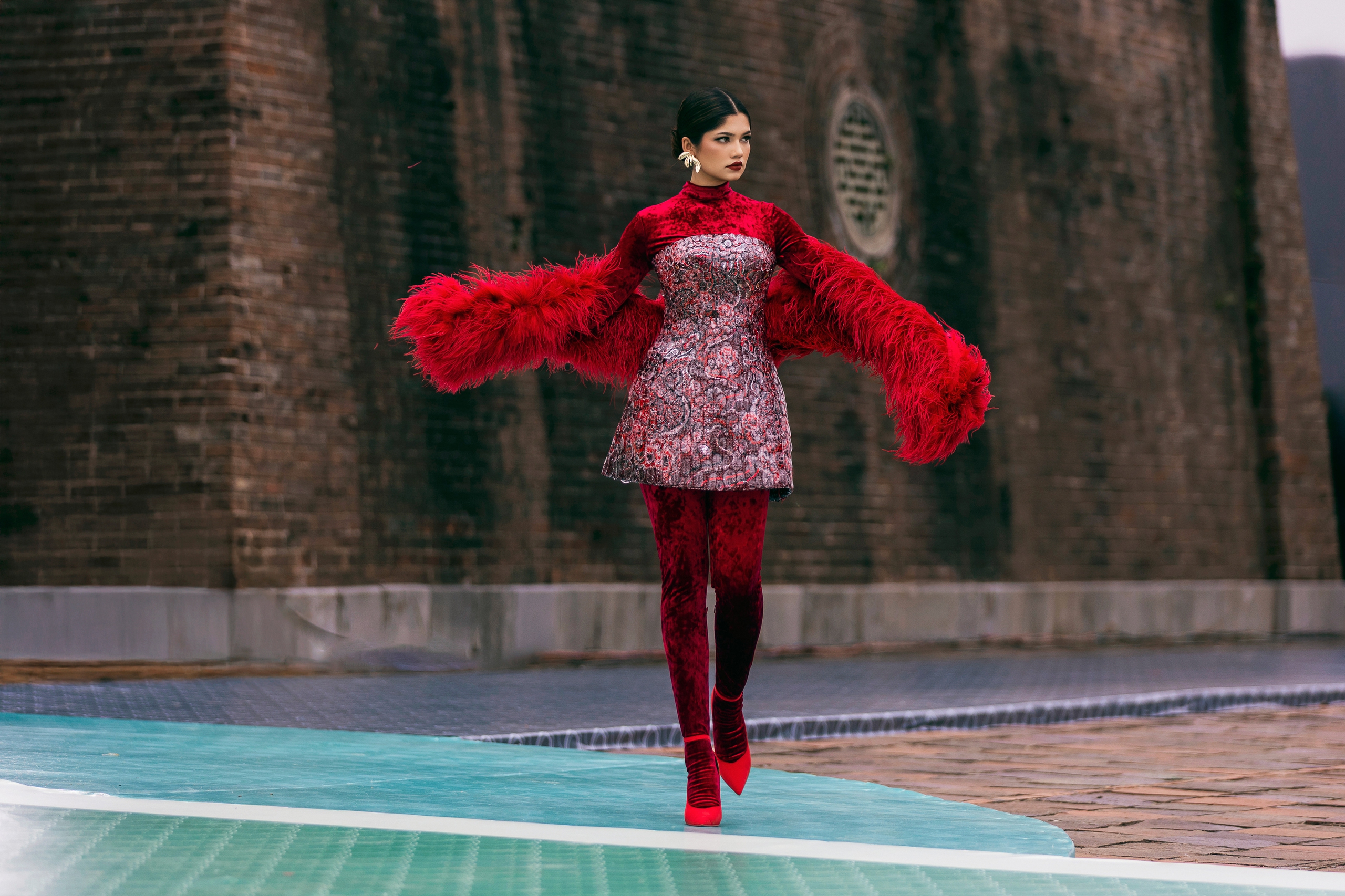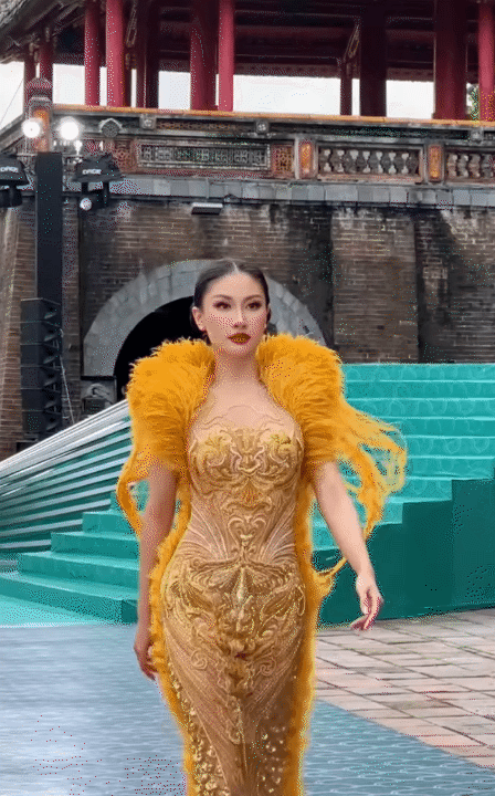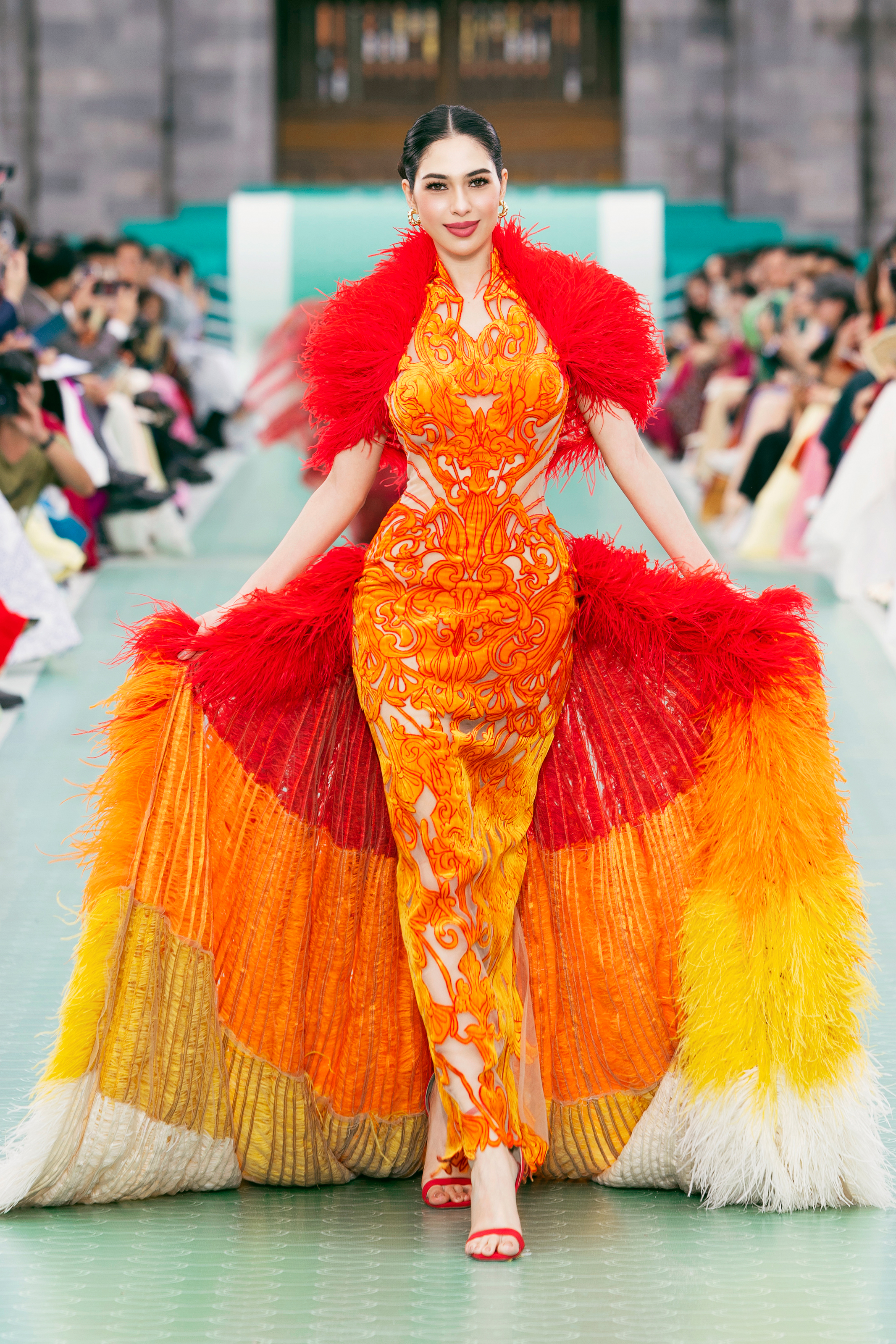 Ngay sau đó, dàn người mẫu là các thí sinh lần lượt sải bước trên nền nhạc mang âm hưởng nhã nhạc. Mỗi thiết kế là một cấu trúc thẩm mỹ nơi NTK Lê Thanh Hòa khai thác tối đa kỹ thuật xử lý chất liệu, phom dáng và màu sắc. Dù bảng màu gồm các tông đỏ, vàng, hồng, tía rực rỡ, vốn rực rỡ nhưng khi phối và tiết chế khéo léo lại không chút chói mắt, trái lại mang đến cảm giác thanh lịch và sang trọng, như một bữa tiệc cung đình qua lăng kính thời trang.