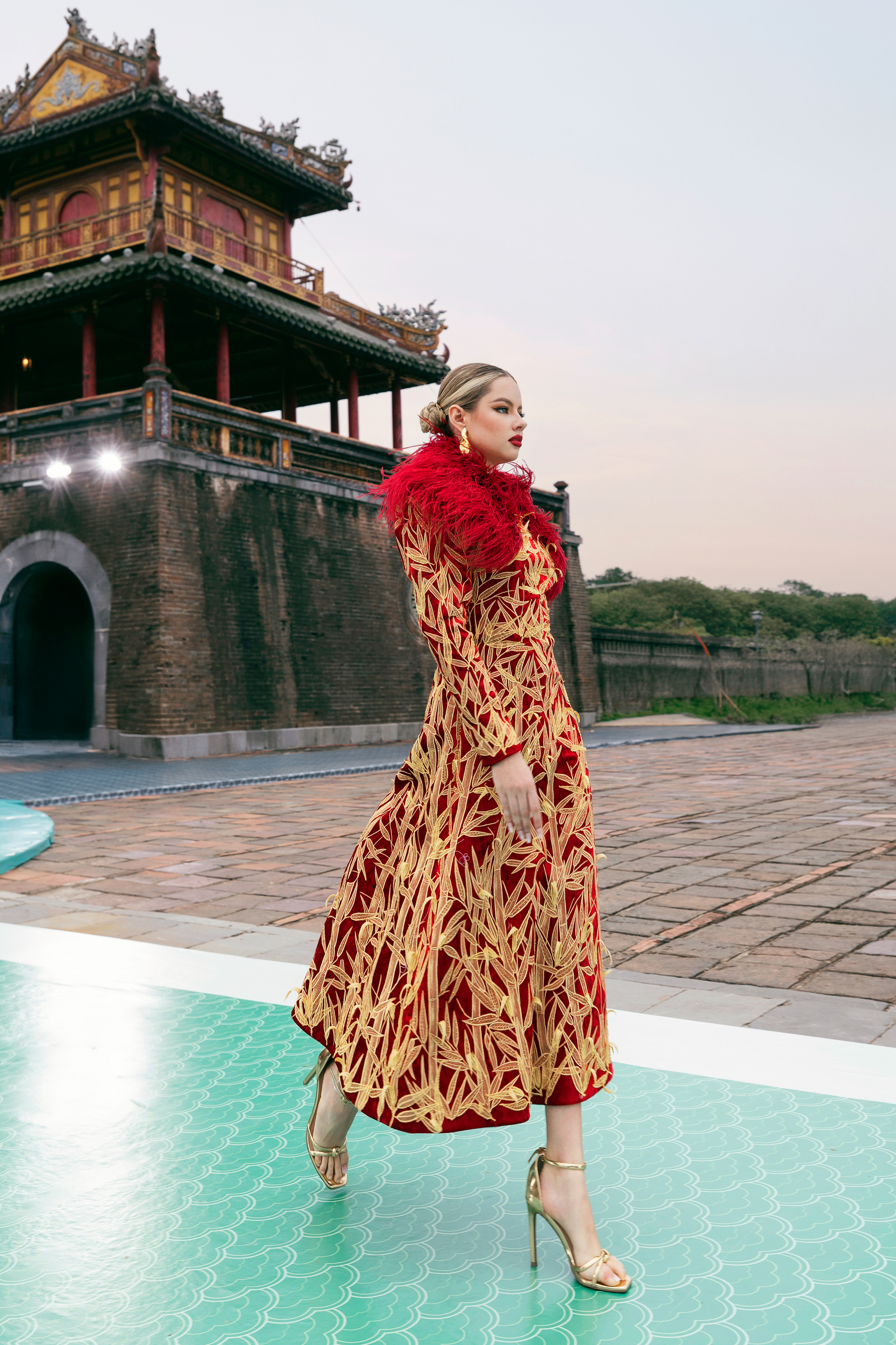 Trong bộ sưu tập, dấu ấn Huế được chuyển tải qua nhiều lớp ngôn ngữ thiết kế: mái ngói rêu phong, tường thành cổ kính, họa tiết rồng phượng, sen mây… được thể hiện bằng kỹ thuật draping mềm mại, thêu tinh xảo, in và đính kết hiện đại. Màu sắc mang hơi thở trầm mặc của cố đô: đỏ ngọc, xanh rêu, nâu gỗ đặc biệt là vàng gold… gợi ký ức về chốn cung đình xa hoa, vàng son một thuở.