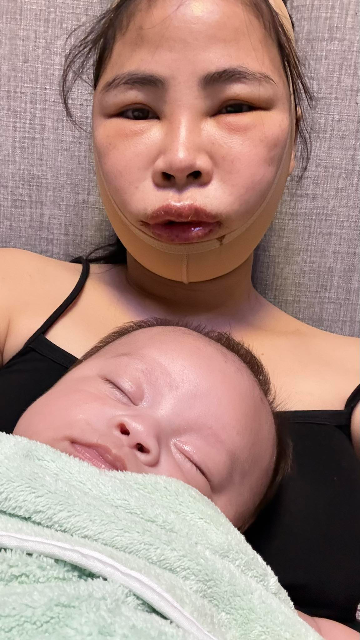 Chia sẻ về trải nghiệm này, cô cho biết: "Mẹ yêu bản thân nhưng cũng yêu con. Dù gì cũng muốn ôm con ngủ. Lúc này là đau lắm nhưng vẫn muốn tự mình chăm con, ôm con ngủ. Mắt sưng lên nên không thể nhìn xuống phía dưới như bình thường để coi con. Lúc nằm ra thì nước miếng chảy liên tục phải lấy khăn thấm. Lâu lâu con moro giật mình lại đụng vào mặt mẹ điếng người luôn".