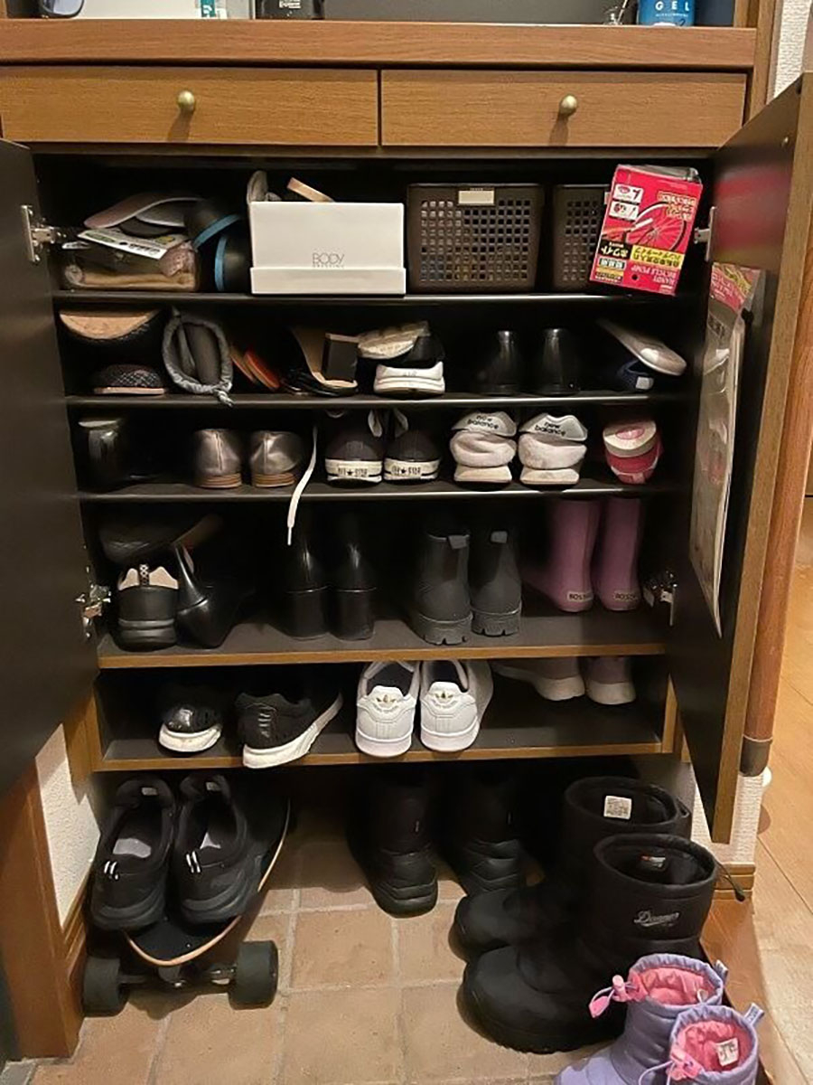 Vì sợ nhà bừa bộn, chị Lưu quyết định đặt đóng một chiếc tủ giày cao kịch trần ở lối vào. Thế nhưng, số lượng giày dép của gia đình chỉ chiếm chưa đến một nửa diện tích tủ.