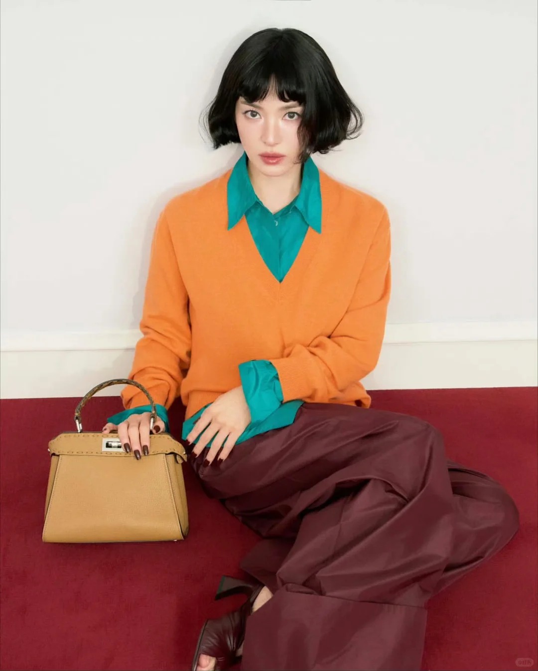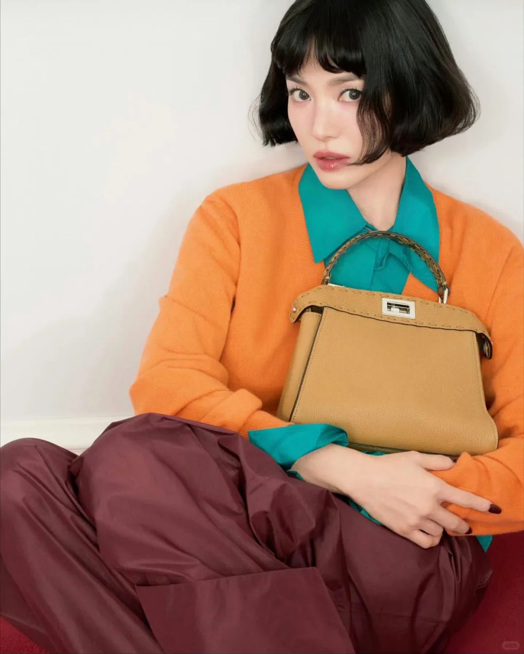 Trong chiến dịch Fendi Peekaboo Digital Campaign 2025, Song Hye Kyo biến hóa liên tục lúc tóc ngắn, lúc tóc dài, khi lại thả nhẹ phía sau. Set đồ cô diện xoay quanh hai gam màu chủ đạo: Xanh ngọc lam và cam cháy.