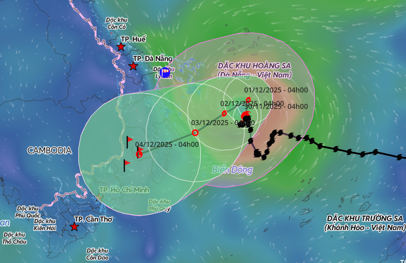 Vào 4h giờ ngày 30/11, tâm bão trên vùng biển phía tây bắc khu vực Giữa Biển Đông với cường độ cấp 9, giật cấp 11. Dự báo trong đêm nay và ngày mai, bão di chuyển hướng bắc, gần như đứng yên với tốc độ chỉ khoảng 3km/h.