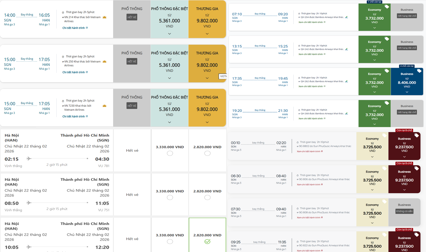 Đối với chặng TPHCM - Hà Nội, trong giai đoạn nghỉ Tết từ 14/2/2026 (tức 27 tháng Chạp năm Ất Tỵ) đến hết 22/2/2026 (mùng 6 tháng Giêng năm Bính Ngọ), giá vé của Vietnam Airlines đang dao động khoảng 7,5 triệu đồng/vé khứ hồi hạng phổ thông; hạng thương gia có thể lên đến 19,6 triệu đồng/vé khứ hồi. Cùng chặng, Vietjet có giá từ 7,1 triệu đồng/vé khứ hồi hạng phổ thông; nếu lên hạng thương gia hành khách cần trả gần 16,4 triệu đồng/vé khứ hồi.