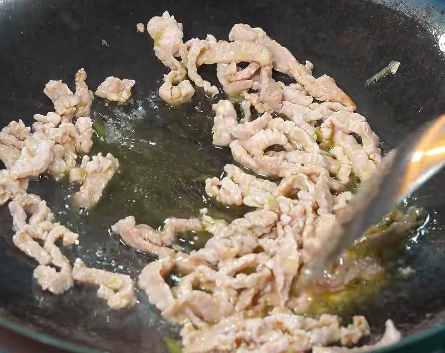 Bước 2: Rửa sạch thịt heo rồi dùng khăn bếp thấm khô nước. Thái thịt thành từng lát mỏng, sau đó cắt thành những dải dài và mỏng. Cho các dải thịt lợn nạc vào bát, thêm một ít nước tương và rượu nấu ăn, chút muối và nửa thìa cafe bột tiêu, phủ một ít bột bắp, rồi rưới một ít dầu ăn. Sau đó trộn đều rồi ướp trong khoảng 15 phút thịt sẽ rất mềm và mịn. Làm nóng chảo, cho một ít dầu ăn vào. Khi dầu nóng, cho thịt nạc thái sợi đã ướp vào. Xào nhanh và đều tay cho đến khi thịt đổi màu, sau đó lấy ra để dùng sau.
