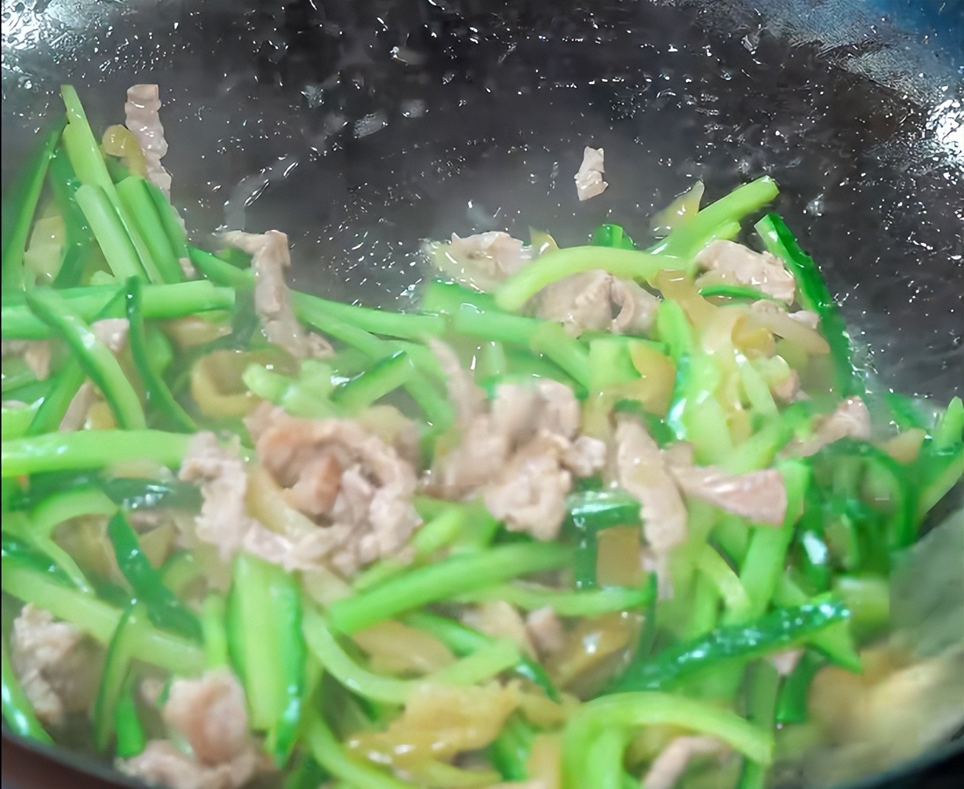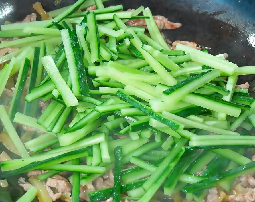 Dưa chuột xào cải muối và thịt heo thái sợi là một món ăn dễ làm và thanh mát. Dưa chuột có màu xanh non, thịt heo thái sợi mềm và mịn, củ cải muối có màu vàng nhạt, vị chua giúp kích thích vị giác. Món ăn rất hấp dẫn. Vị giòn tan, tươi mát, và thịt heo đặc biệt mềm. Sự kết hợp giữa thịt và rau củ khiến món ăn không hề ngấy. Nước sốt sánh sệt rất hợp để ăn kèm với cơm!
