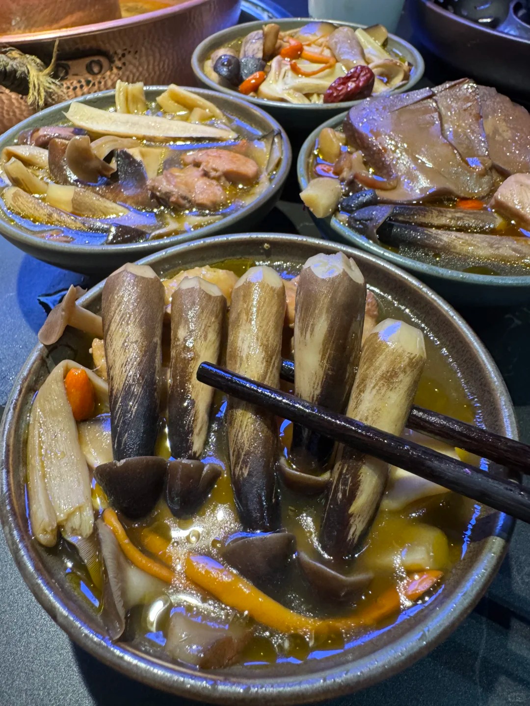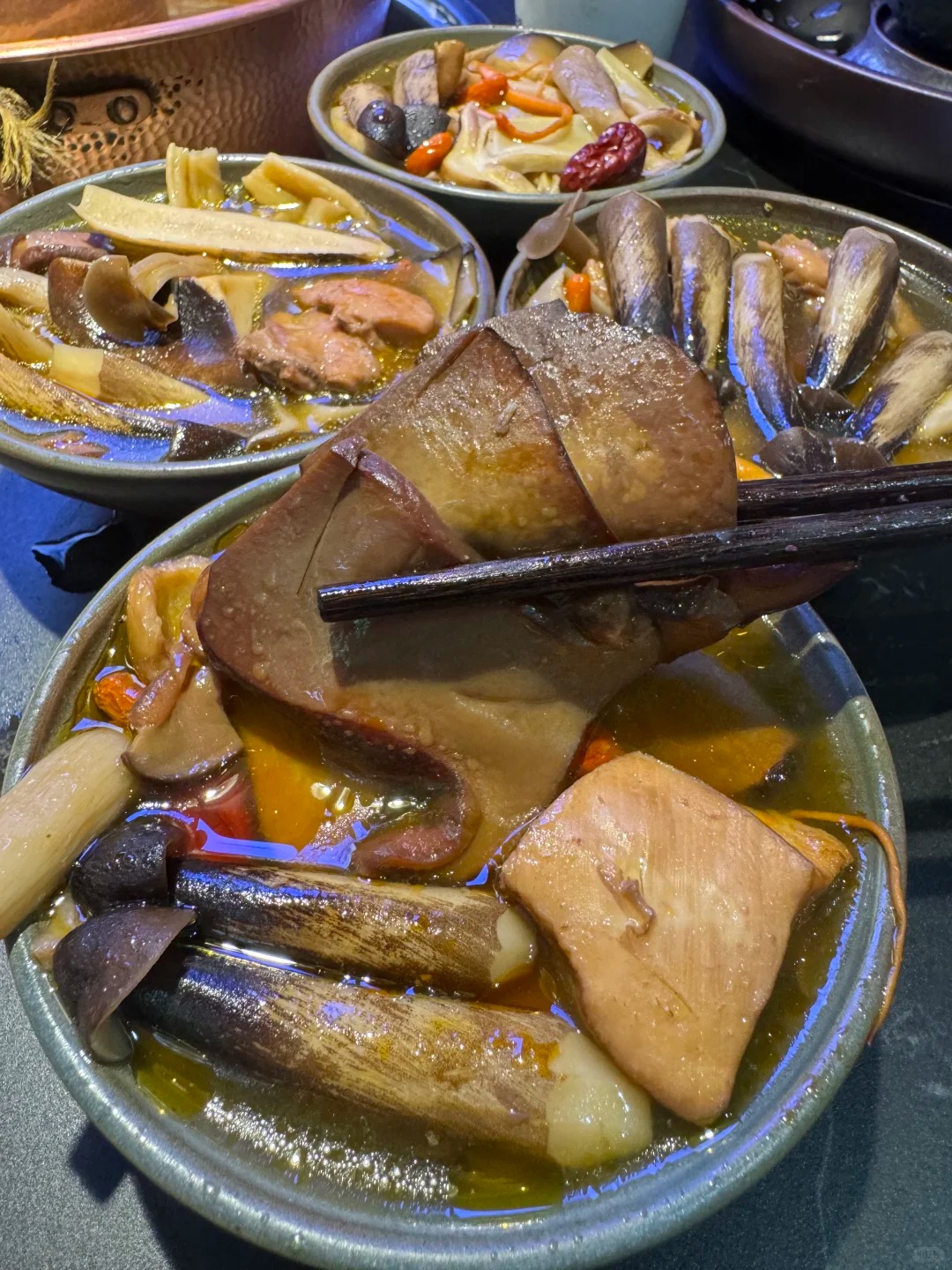 Khi nước dùng sôi sùng sục, người ta sẽ thả vào đó một "bảo tàng" nấm rừng tinh túy nhất từ nấm bụng dê dai giòn, nấm thông thịt dày ngậy béo, cho đến loại nấm "kiến thủ thanh" đổi màu huyền thoại mọc dưới những tán thông già. Việc đầu tiên cần làm không phải là vội vã gắp thức ăn, mà là múc một bát nước dùng trong vắt, thổi nhẹ và húp một ngụm thật sâu. Cái ngọt thanh khiết len lỏi vào dạ dày, làm ấm bừng cả cơ thể. Từng miếng nấm sau khi luộc chín kỹ có độ giòn sần sật, nhai đến đâu vị ngọt tự nhiên ứa ra đến đó, càng ăn càng thấy cuốn mà không hề vương lại chút cảm giác nặng nề.