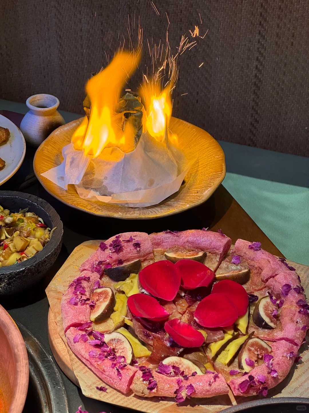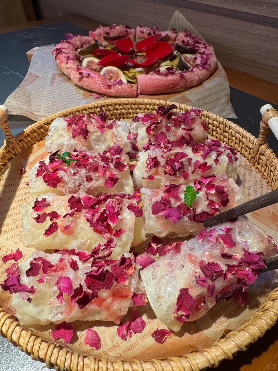 Cảm giác này có đôi chút gợi nhớ đến chiếc bánh tráng nướng mộc mạc của Đà Lạt quen thuộc với người Việt, nhưng lại mang một phong vị và đẳng cấp hoàn toàn khác biệt. Khi cắn một miếng lúc chiếc bánh vừa được đưa ra khỏi lò, độ nóng hổi làm chảy lớp phô mai béo ngậy, quyện chặt lấy vị mằn mặn, cái ngòn ngọt, dẻo thơm của nấm và chút chát nhẹ, thanh tao của hoa hồng.