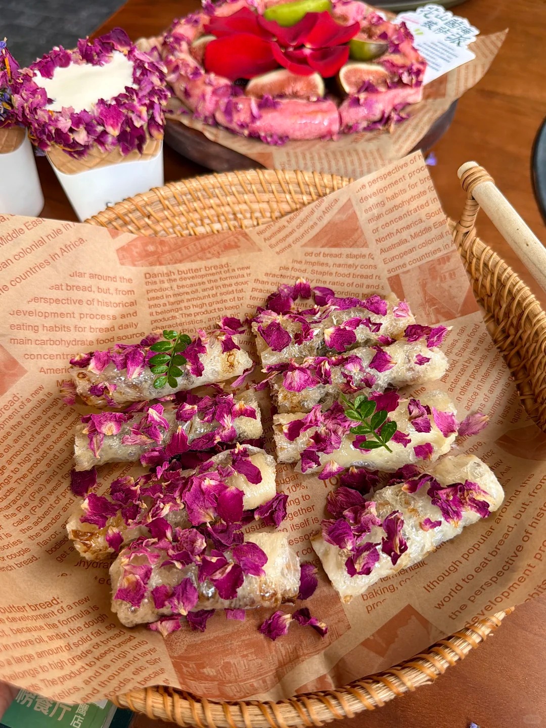 Nhấp một ngụm đồ uống ngọt dịu, cắn thêm một miếng cuốn hoa hồng nấm sữa (nhũ phiến) nướng trên bếp than hồng, mọi giác quan của bạn dường như được xoa dịu. Lớp màng sữa nướng có mùi thơm ngậy đặc trưng, kết hợp cùng nhân nấm và hoa hồng bên trong tạo nên độ béo ngọt vừa vặn đến mức dẫu có ăn liên tục cũng không hề thấy ngán.