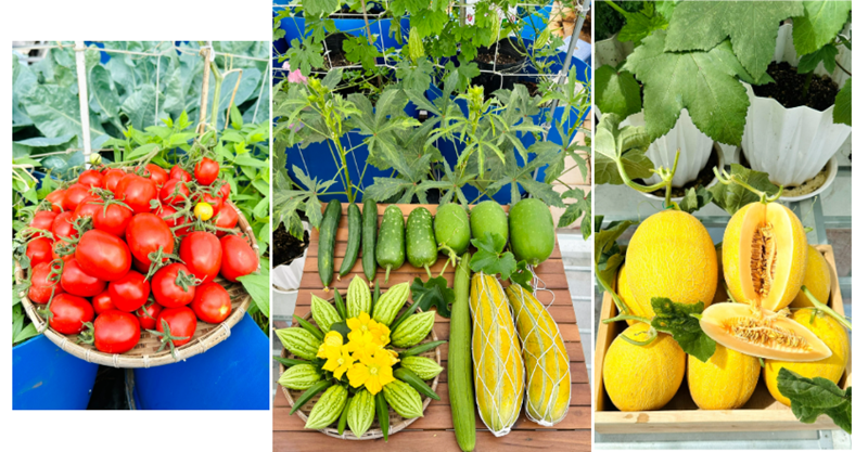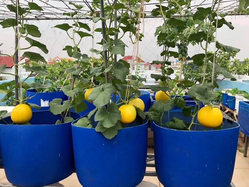 Chị khéo léo phân chia khu vực canh tác thành hai phần chính: sân thượng tầng 3 rộng 50m2 ưu tiên cho các loại cây leo giàn và cây ăn trái như bầu, bí, mướp, táo Thái, ổi Đài Loan, thanh long và các loại dưa; trong khi đó, ban công tầng 2 rộng 20m2 là nơi dành riêng cho các loại rau ăn lá và rau thơm.