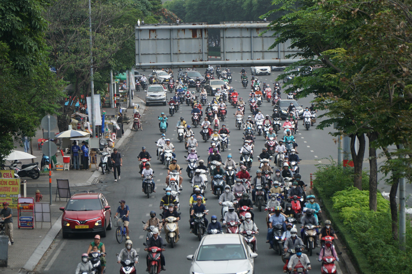 Trên các trục giao thông lớn như Võ Văn Kiệt, Xa lộ Hà Nội,… có thời điểm tầm nhìn giảm rõ rệt, người tham gia giao thông phải bật đèn xe để bảo đảm an toàn.