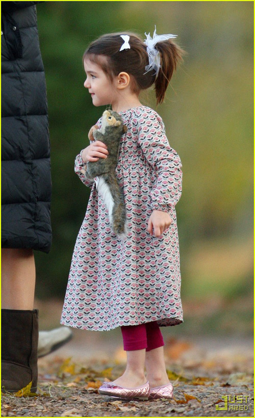 Cô bé 3 tuổi dễ thương với mái tóc dài buộc vổng đuôi, Suri ôm một con sóc nhồi bông xinh xắn và chạy quanh bên mẹ.