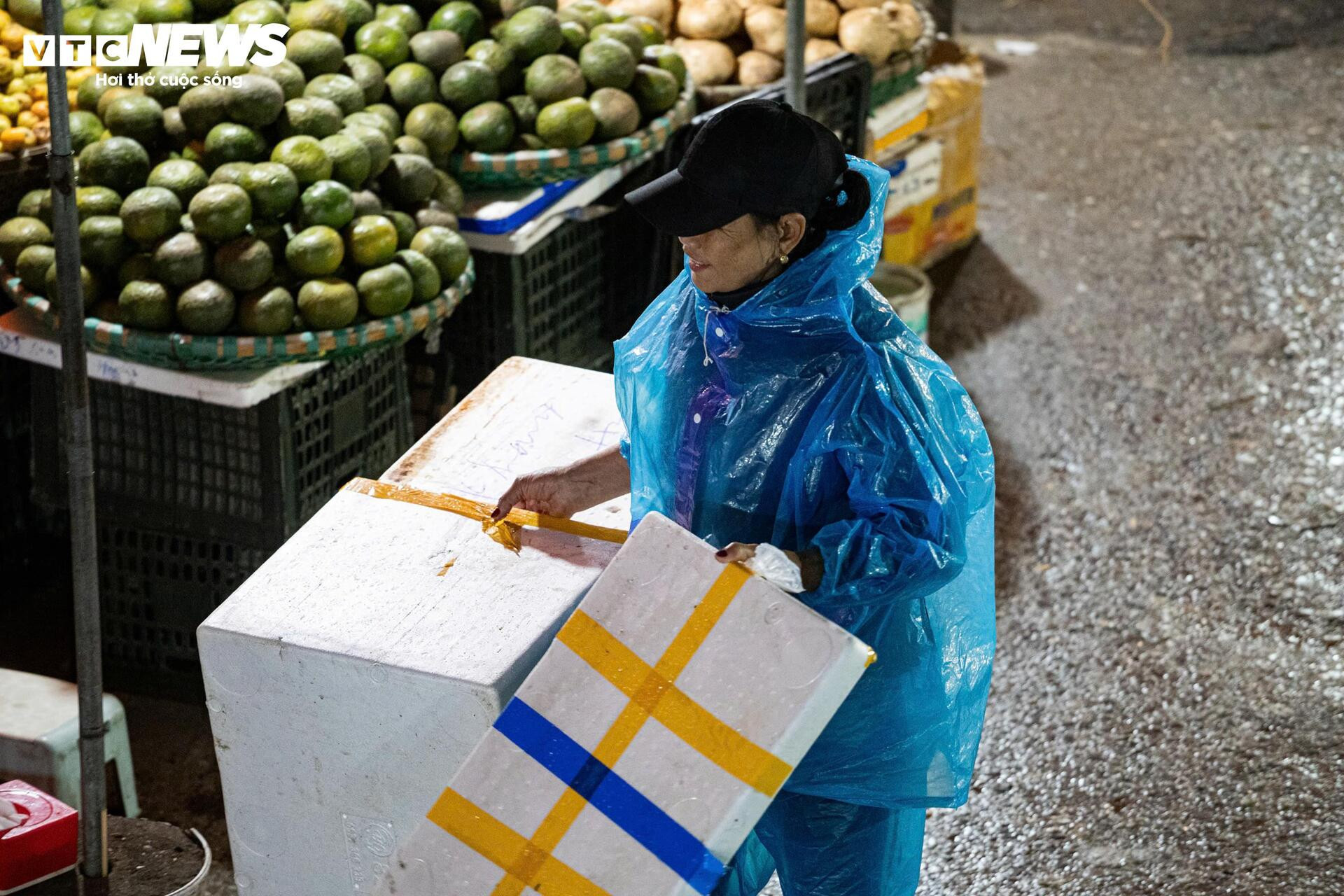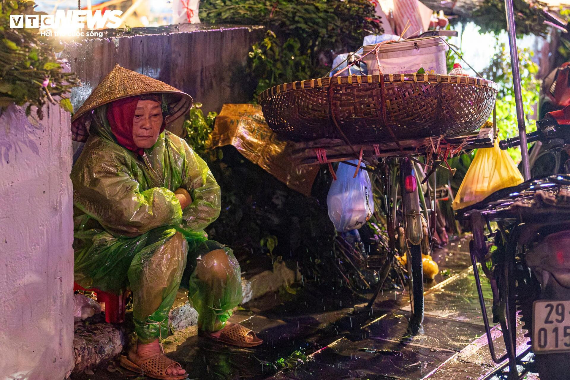 Ngoài việc mặc thêm nhiều lớp quần áo, người phụ nữ khoác thêm áo mưa giấy để chắn gió.