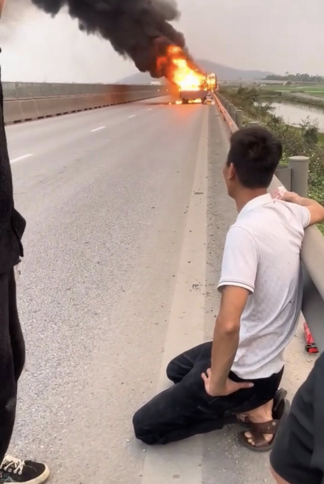 Hình ảnh người đàn ông ngồi bệt xuống lề đường, tay bám vào lan can, ánh mắt thất thần nhìn tài sản bị thiêu rụi khiến nhiều người xem không khỏi xót xa. Theo nội dung video do người đi đường ghi lại, sau khi đám cháy được khống chế, tài xế vẫn chưa thể rời khỏi hiện trường. Anh ngồi gục xuống nền đất, có lúc ôm mặt khóc.
