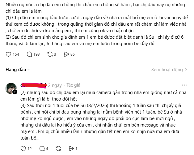 Đoạn tâm sự như sau: "Chị dâu em mang bầu trước cưới... ngày đầu về ra mắt ở lại vài ngày để thử xem có được không... Sau đó chị dâu em sinh bé Su, em và mẹ em luôn trông nom bé đầy đủ. Nhưng sau đó chị dâu lại mua camera gắn trong nhà giống như cả nhà em bị theo dõi... Khoảng 1 tuần sau thôi nôi, chị ấy đau bụng nằm viện hết 1 tuần... chị nhắn chửi em và nhục mạ em. Em bị chửi nhiều lần rồi nên gần Tết em không nhịn nữa mà em đưa toàn bộ...".