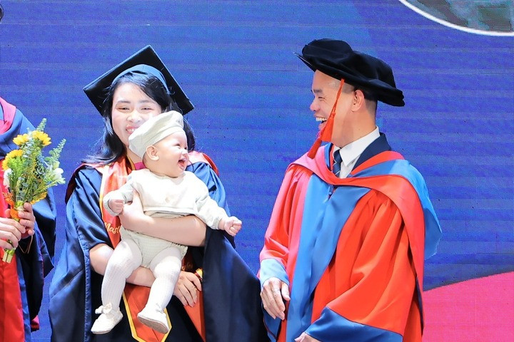 Tại lễ trao bằng tốt nghiệp của Trường Đại học Hà Nội (HANU) mới đây, một nữ thạc sĩ trong trang phục tốt nghiệp, trên tay bế em bé kháu khỉnh, tự tin bước lên sân khấu nhận bằng, khiến những người tham dự tại hội trường bất ngờ và xúc động. Những tràng vỗ tay vang lên không ngớt khi chứng kiến khoảnh khắc đặc biệt này.