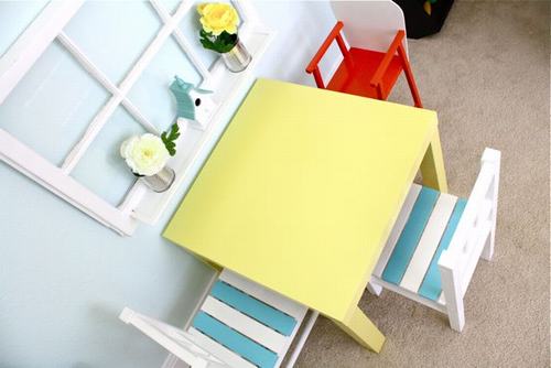 Bàn học sơn màu vàng, phía trên có hình khung cửa cùng hai lọ hoa xinh xắn. Chiếc ghế cũng màu xanh trắng.