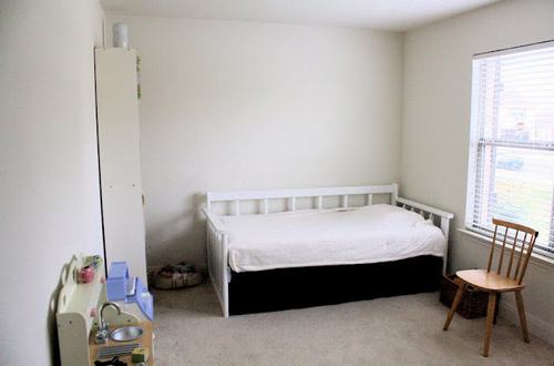 Không gian ban đầu của bé trông đơn điệu với bức tường, giường, ga trải giường, tủ sách và tủ đựng đồ đều cùng tông màu trắng. Mặc dù trong phòng có một vài thứ với sắc màu vui nhộn nhưng điều đó vẫn chưa đủ sức để tạo sự hấp dẫn cho không gian này.
