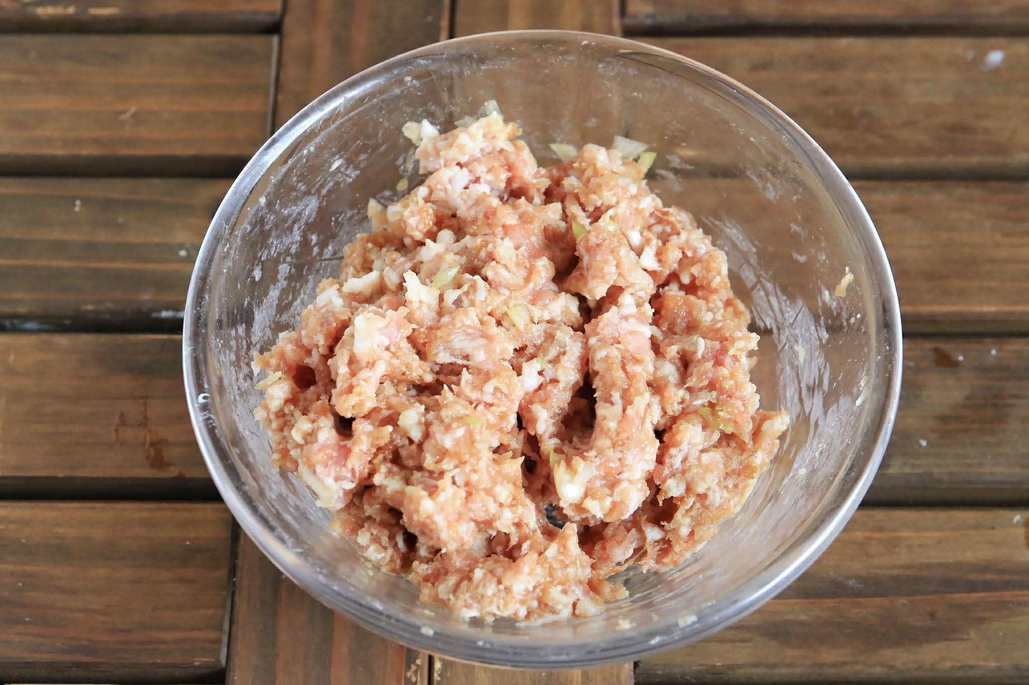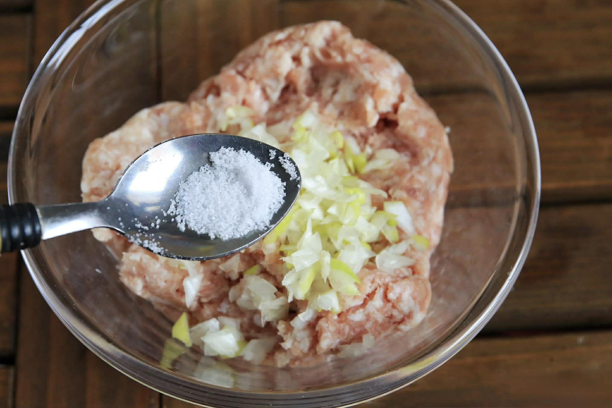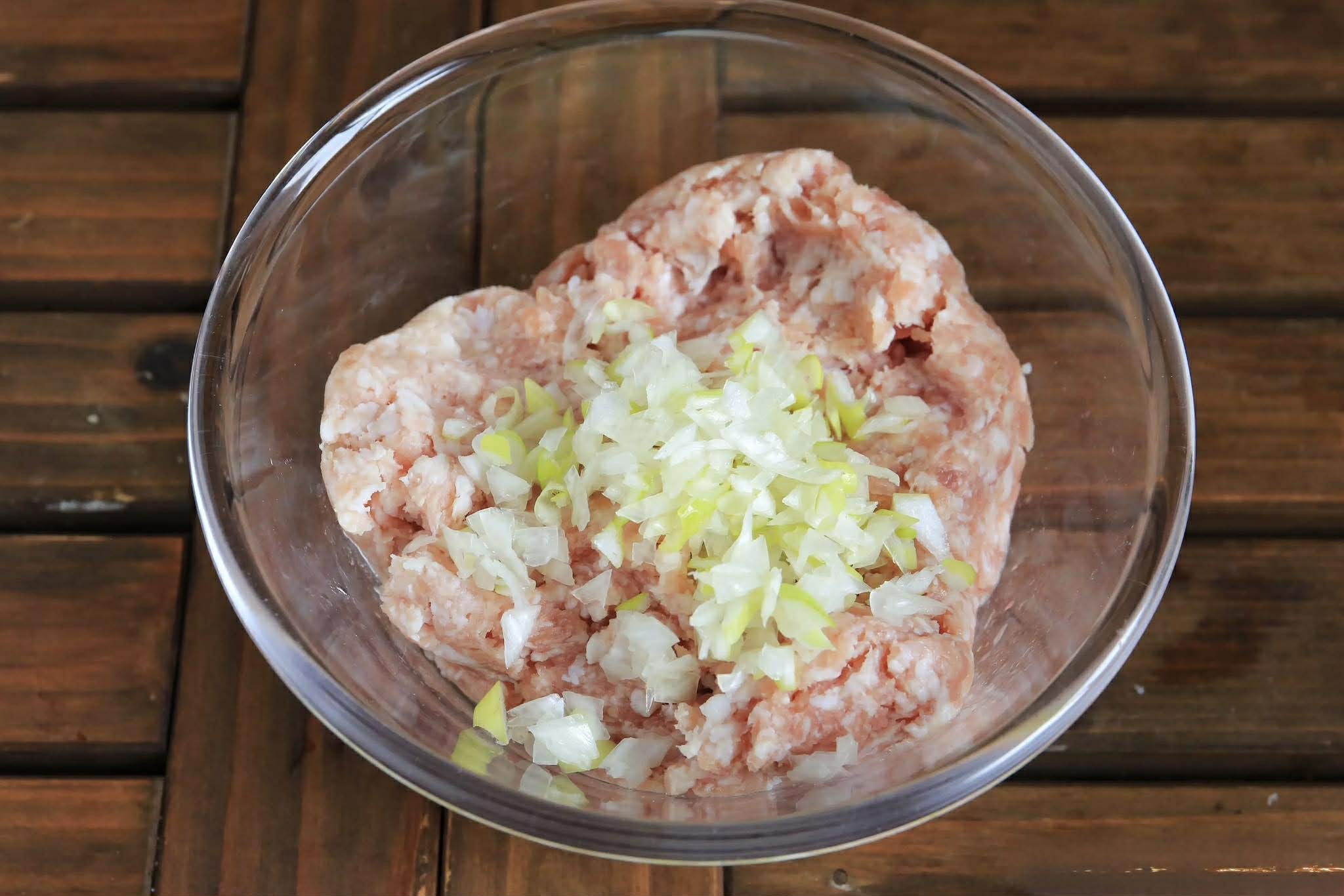 Bước 2: Gốc hành lá băm nhỏ bạn cho vào tô đựng thịt băm. Nêm thêm chút muối, rượu nấu ăn, 1 muỗng canh nước tương, một lượng tinh bột ngô thích hợp. Tiếp đó bạn thêm bột nêm gà rồi dùng đũa khuấy theo một chiều cho đến khi hỗn hợp đặc lại.