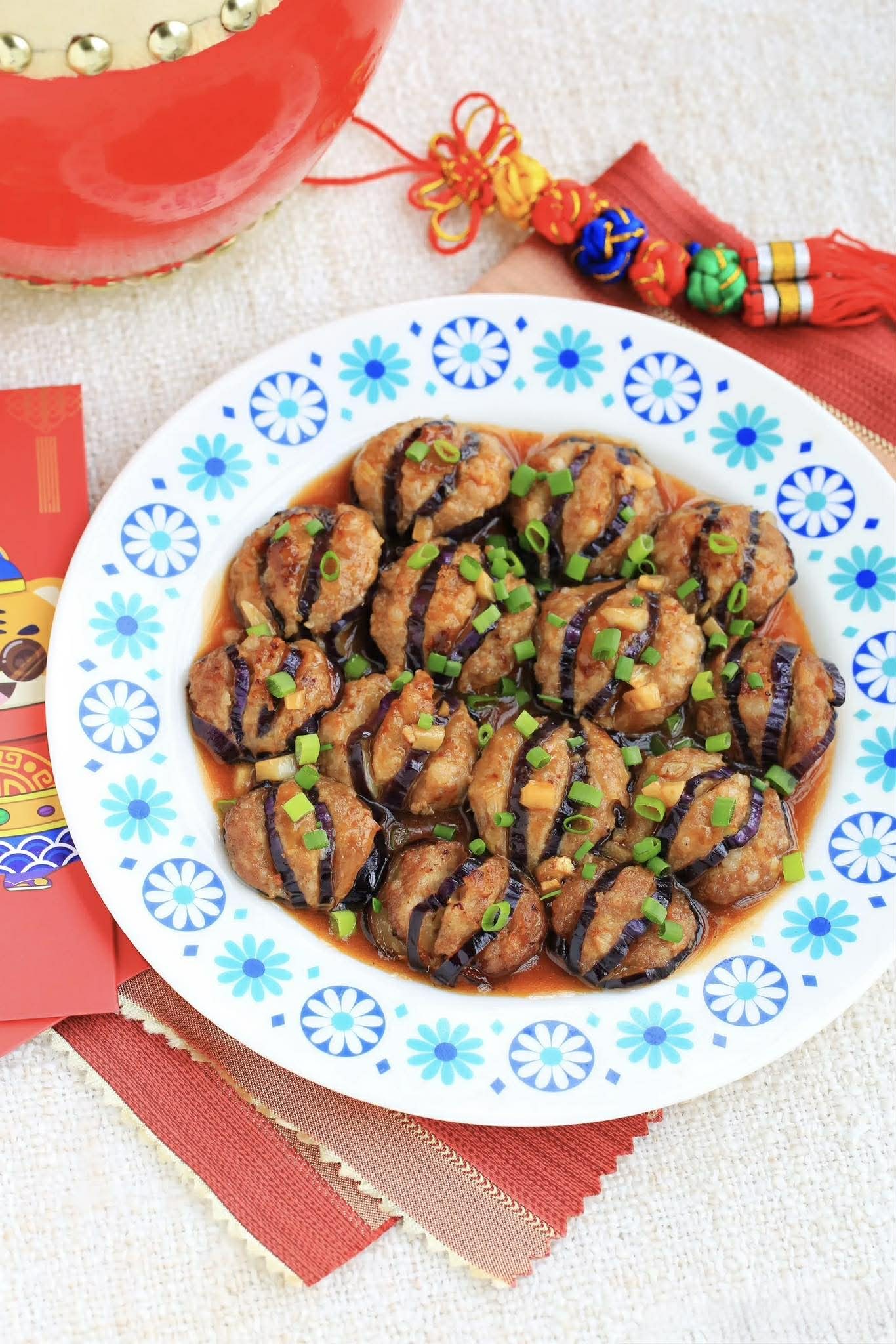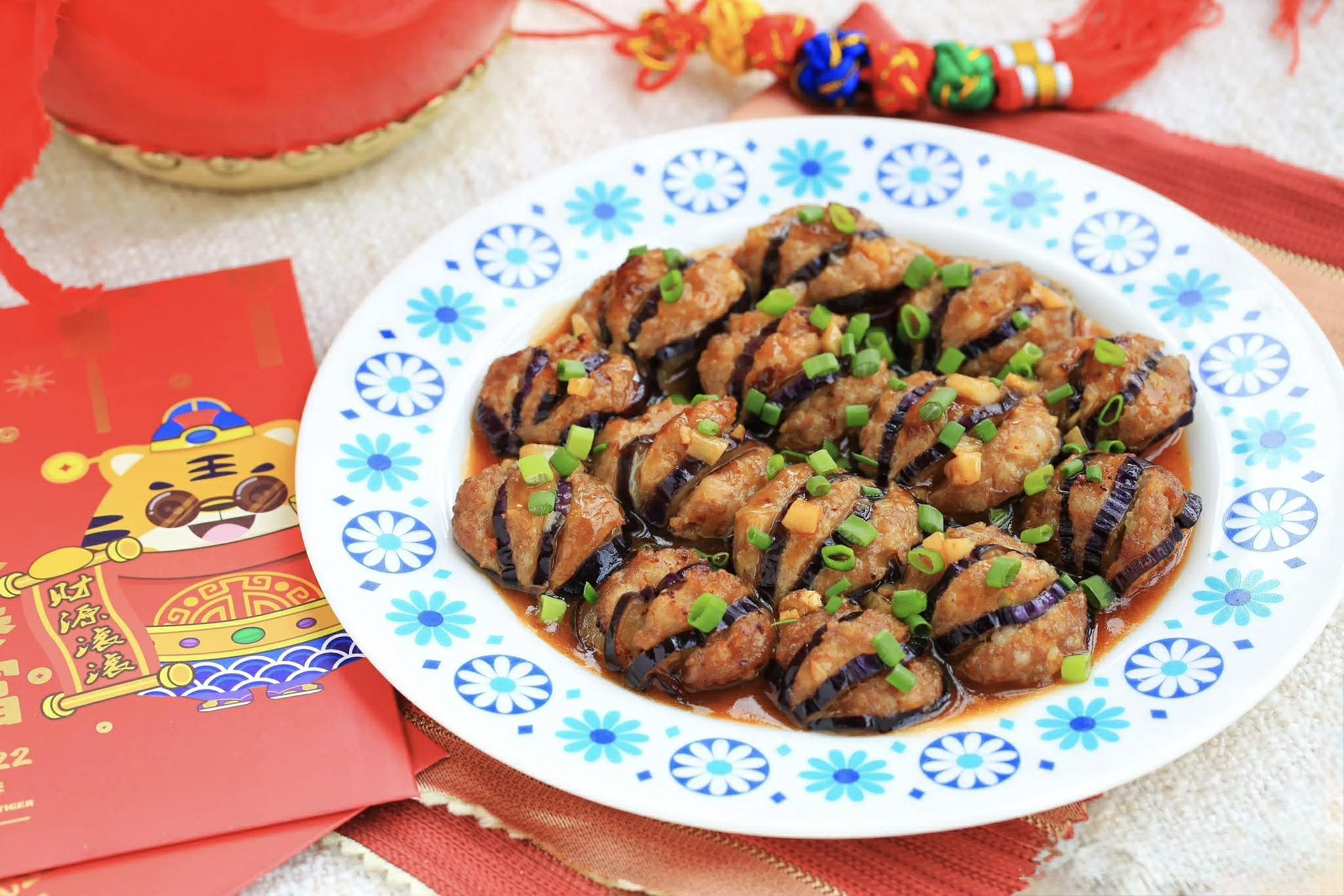 Trên bàn tiệc năm mới, sự kết hợp giữa hình thức và ý nghĩa là điều làm nên sự hấp dẫn nhất. Món ăn này được làm từ cà tím, nhồi thịt băm và tạo hình như một chiếc đèn lồng, dùng kèm với nước sốt cà chua chua ngọt, mang ý nghĩa "đèn lồng tỏa sáng rực rỡ và may mắn sẽ đến với bạn". Đây là một món ăn làm rất đơn giản nhưng đáng có trên bàn tiệc năm mới.