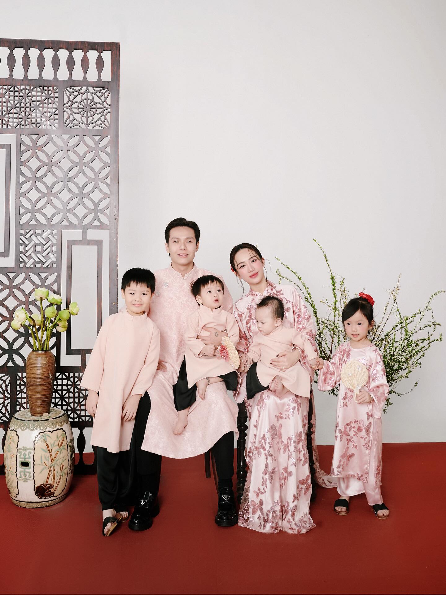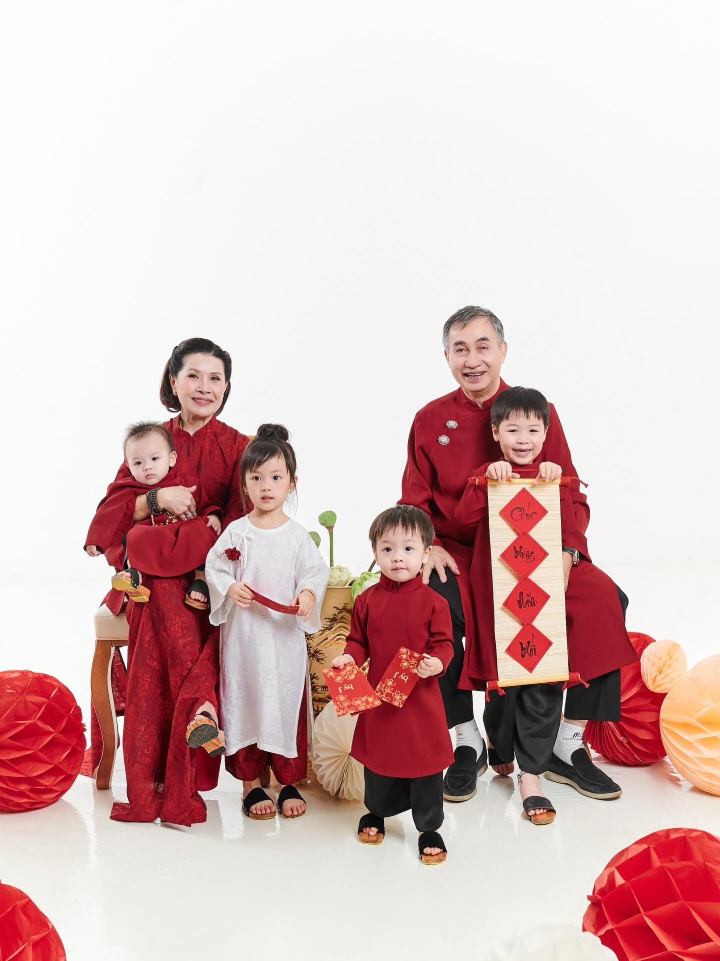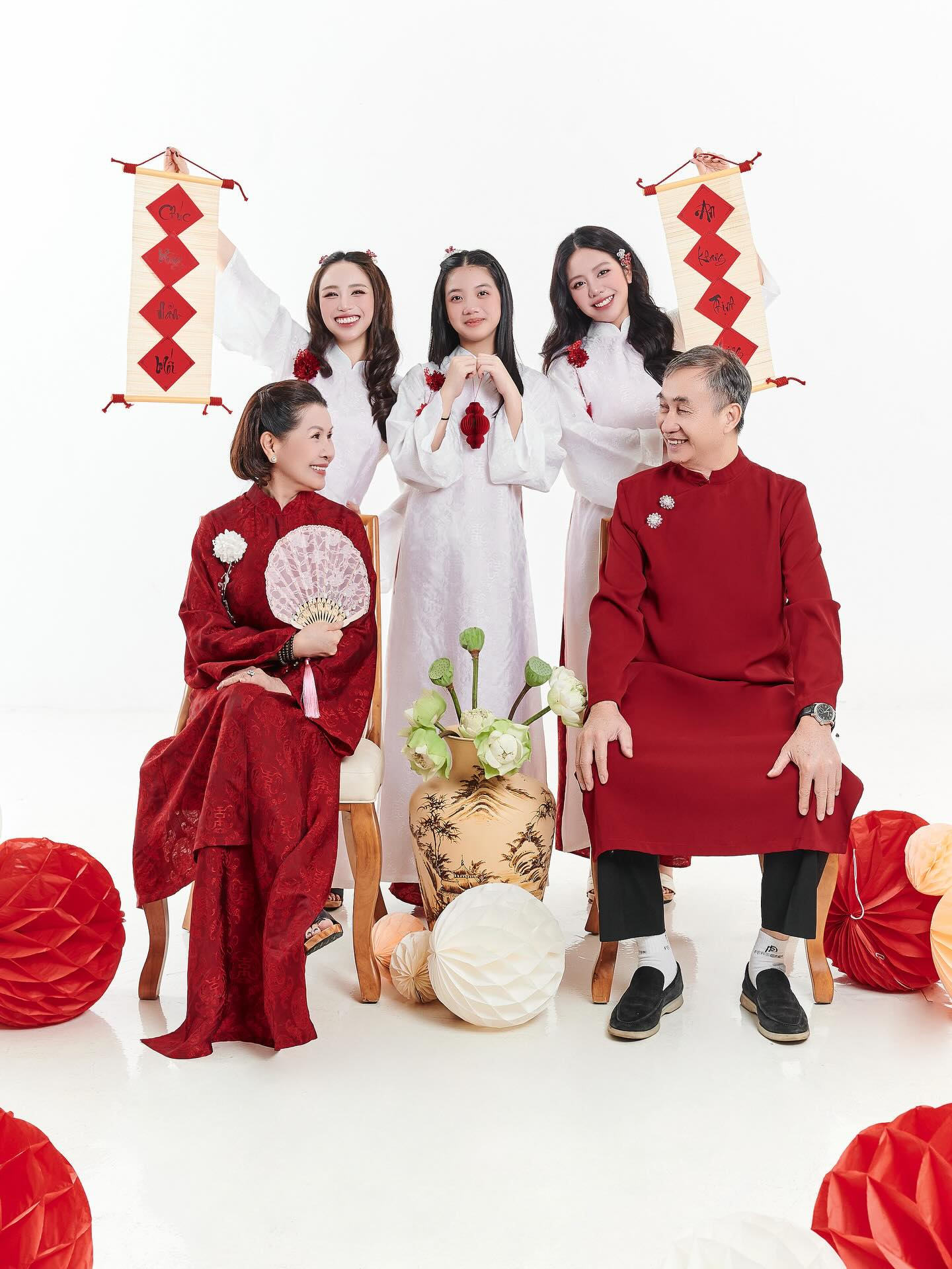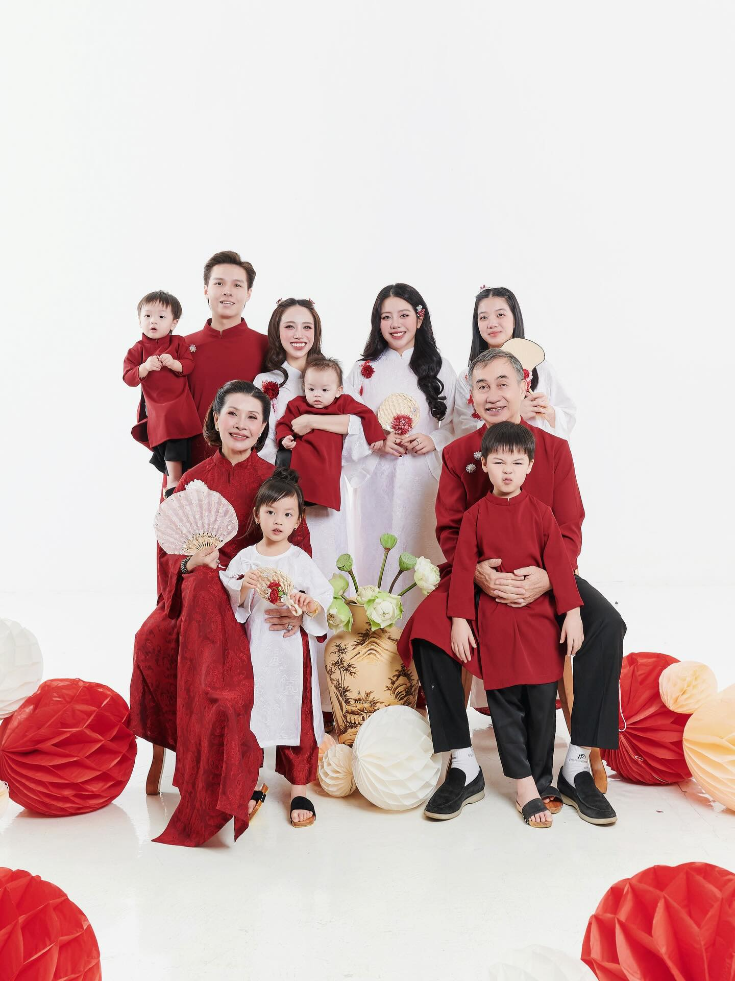 Trong bộ ảnh năm nay, đại gia đình cùng nhau diện áo dài Tết đồng điệu, mang tông màu trang nhã, nền nã nhưng vẫn nổi bật nét sang trọng đặc trưng. Các thành viên quây quần bên nhau, nở nụ cười rạng rỡ, tạo nên khung cảnh sum vầy viên mãn - điều mà nhiều người ao ước trong dịp Tết cổ truyền.