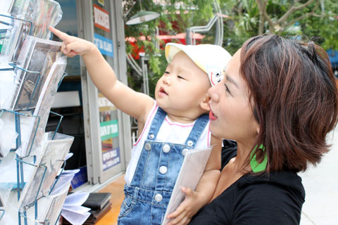 Hai mẹ con ngắm những tấm bưu thiếp về Hà Nội xưa.