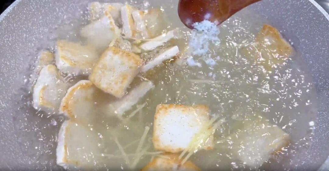 Bước 2: Làm nóng chảo, xịt một lượng dầu ăn vừa đủ, sau đó cho từng miếng đậu phụ đã thái lát vào. Chiên trên lửa nhỏ cho đến khi một mặt vàng nâu, sau đó lật mặt kia và tiếp tục chiên trên lửa nhỏ cho đến khi cả hai mặt đều vàng nâu. Tiếp theo, vặn nhỏ lửa và cho nước sôi vào để làm dậy mùi thơm của đậu phụ. Sau đó cho gừng thái sợi và lượng gia vị và tinh chất cốt gà vừa đủ vào. Đun sôi nước.