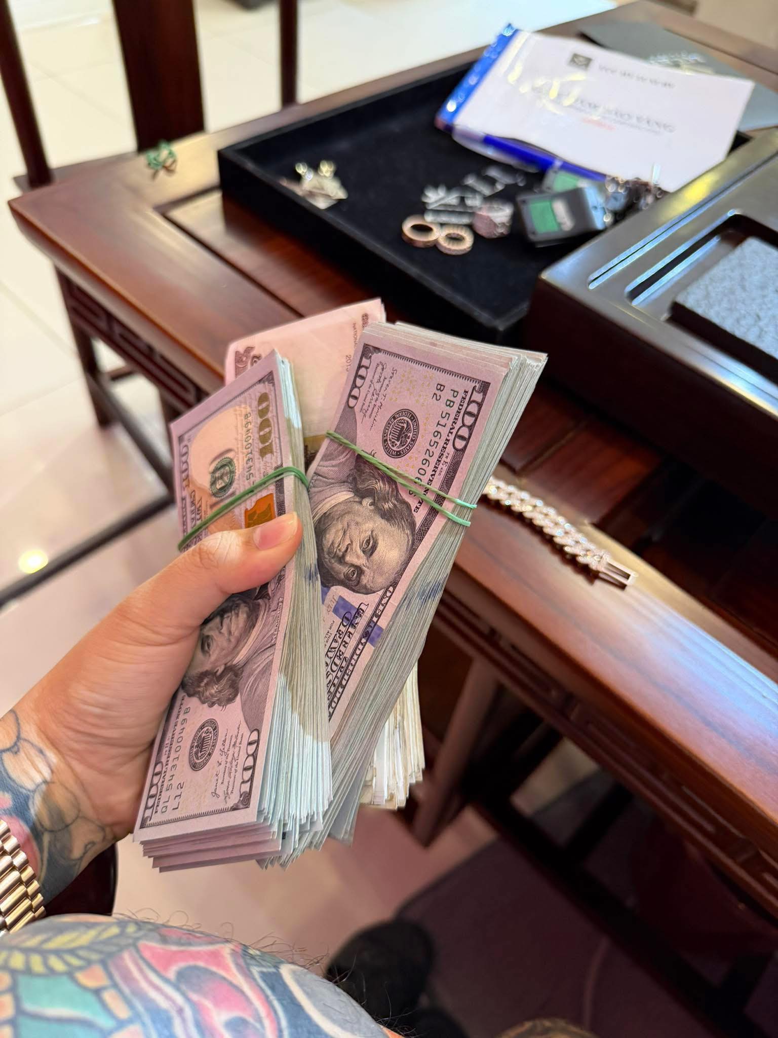 Trong một lần ngẫu hứng "bóc giá" trang phục thường ngày, chàng trai 9X khiến cõi mạng phải choáng váng thực sự: Quần tây sương sương 1,1 triệu, áo sơ mi Burberry 11 triệu, thắt lưng Louis Vuitton 16 triệu đồng nhưng điểm nhấn là chiếc mặt dây lưng bằng vàng nguyên khối đính kim cương giá lên tới 180 triệu. Chưa kể, trên tay anh là chiếc đồng hồ Rolex ngót nghét 300 triệu, đeo kính mắt họa tiết vàng, đến cả chiếc móc khóa ô tô Mercedes cũng phải làm bằng vàng 18K cho "tông xuyệt tông".