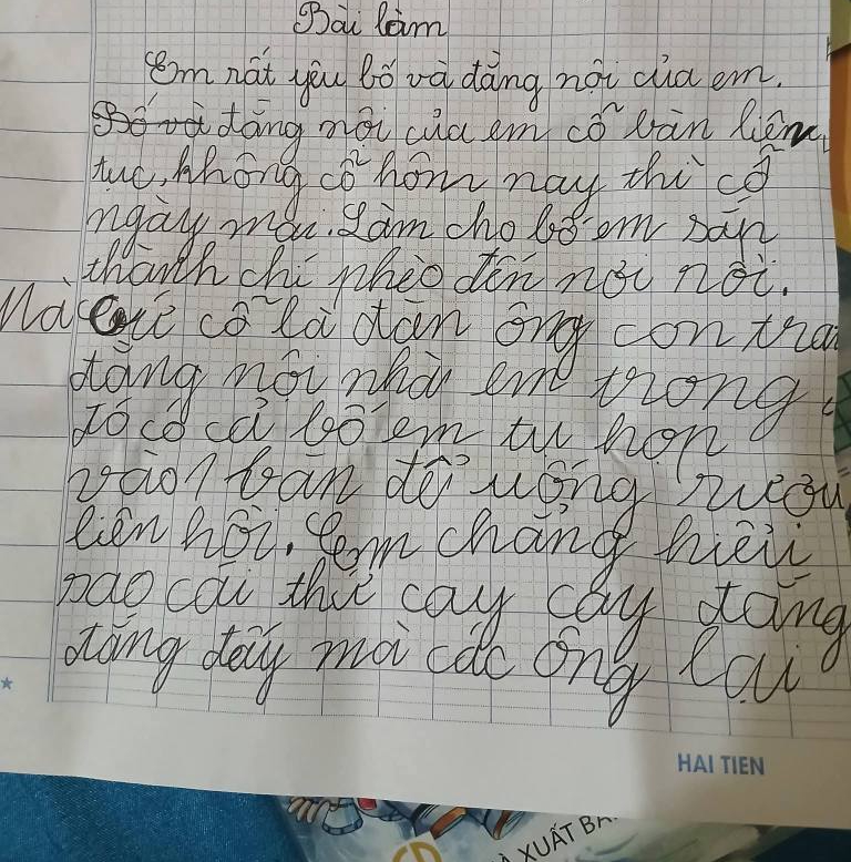 “Hôm nay thấy ngăn bên hông balo con có rác, mình moi ra vứt đi, vô tình đọc được bài văn của con. Chắc con viết ở lớp” - một bà mẹ chia sẻ trên mạng xã hội, kèm theo tấm ảnh chụp lại bài văn học trò nguệch ngoạc chữ, giấy đã nhàu và lem mực. Bài viết nhanh chóng thu hút hàng chục nghìn lượt tương tác. Nhiều người thú nhận: đọc thì bật cười, nhưng đọc xong lại thấy nghèn nghẹn.
