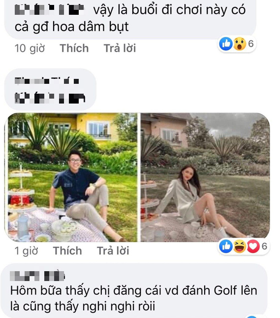 Bên cạnh bằng chứng về khung cảnh buổi ăn tối, cư dân mạng còn tinh ý phát hiện dạo này Hương Giang bỗng nhiên có thêm 1 sở thích mới khi cô nàng khoe clip tập đánh golf trên Tiktok. Chưa kể, Hương Giang đã có chuyến đi Đà Lạt với nhà Hoa dâm bụt vào tầm cuối tháng 6. Cô nàng chụp hình với chủ đề buổi cắm trại khá sang chảnh trên 1 bãi cỏ.