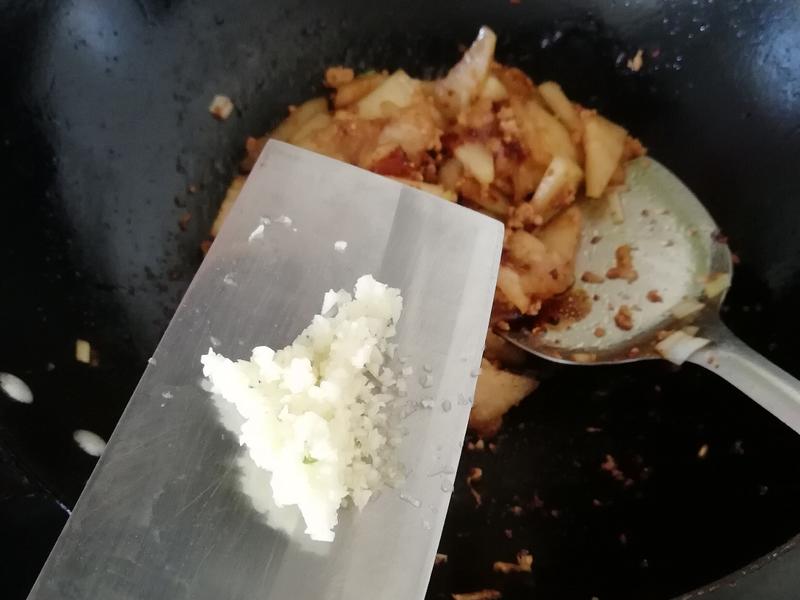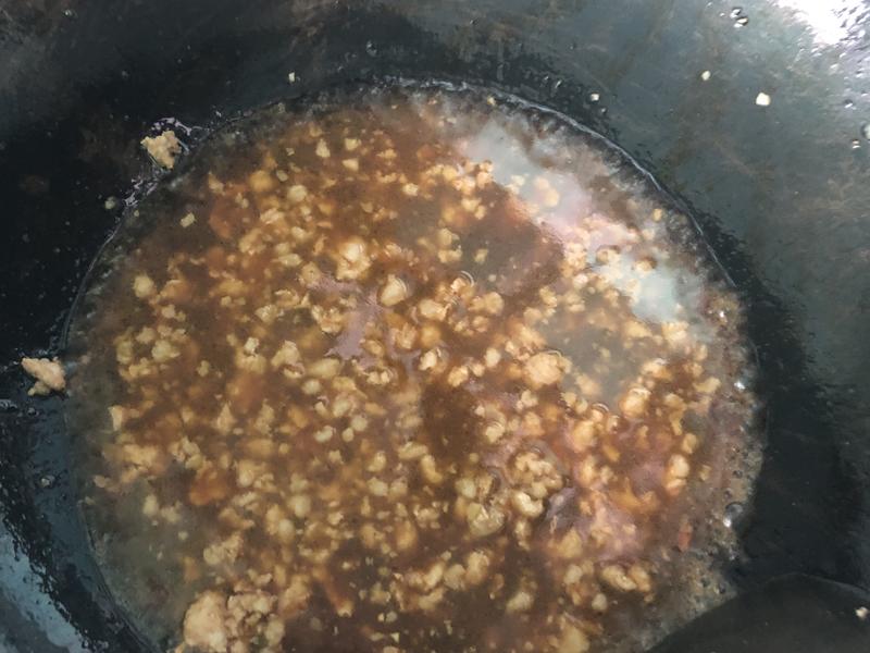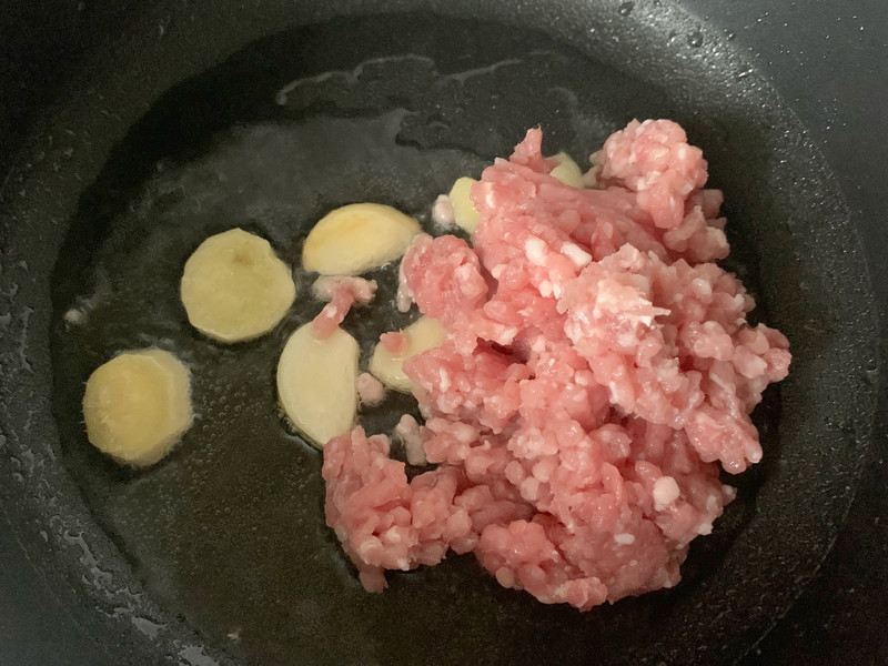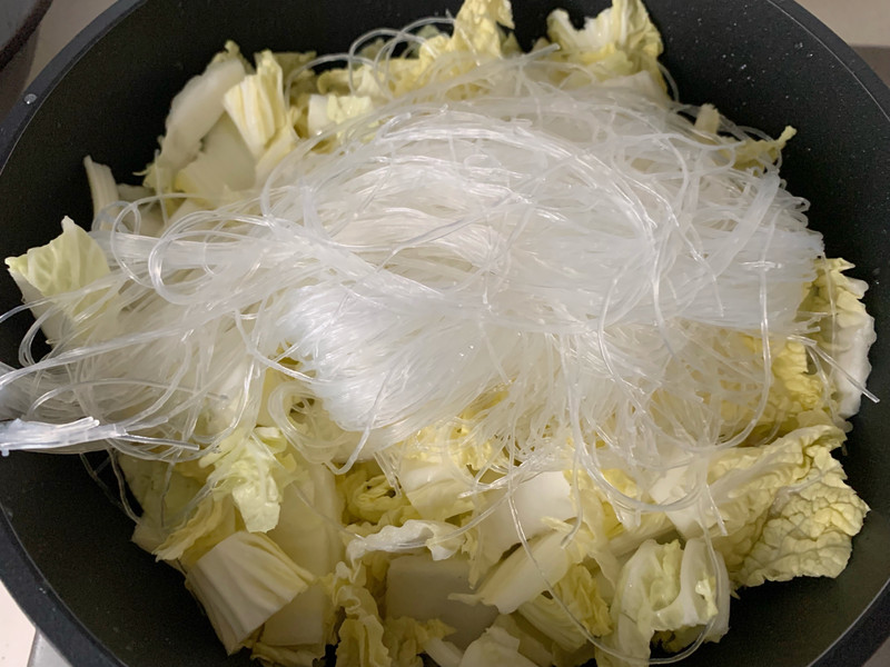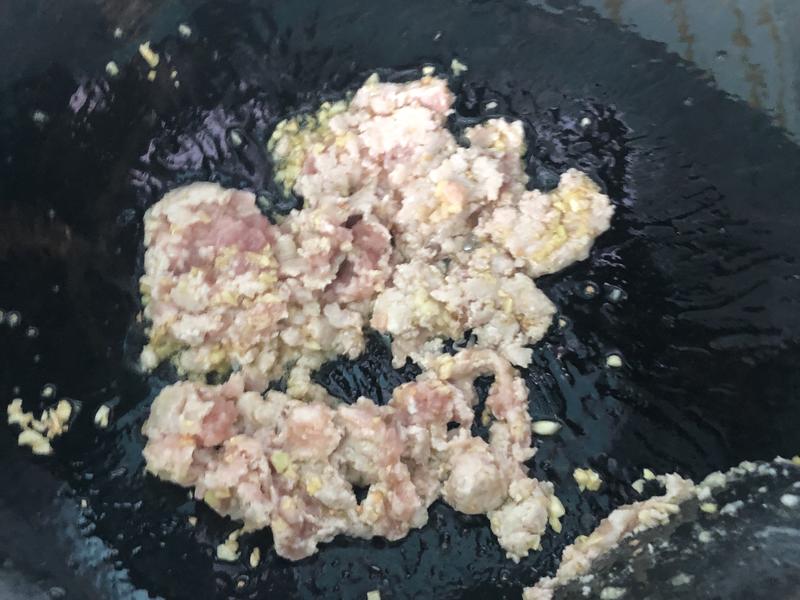 Bước 2: Đặt nồi lên bếp, cho tỏi băm và gừng vào phi thơm. Tiếp theo cho thịt băm, rượu nấu ăn vào và xào đến khi đổi màu. Sau đó cải thảo và miến đã ngâm vào. Sau đó thêm nước tương, dầu hào, 1 bát nước nhỏ, đậy nắp nồi và đun nhỏ lửa trong thời gian ngắn cho đến khi rau chín mềm thì tắt bếp.