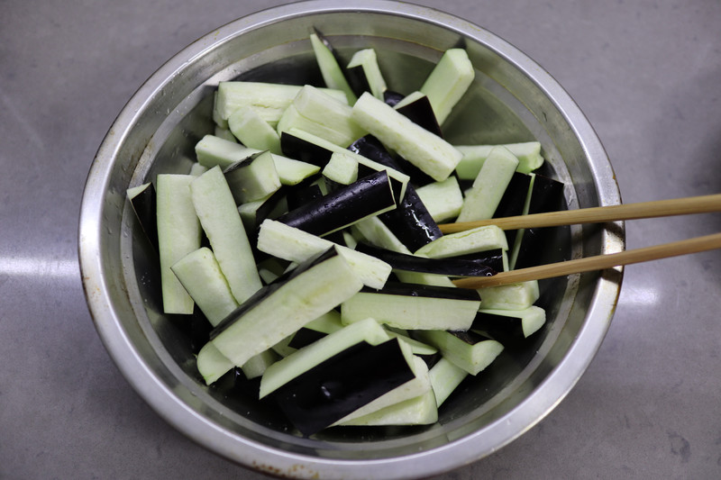 Bước 1: Bỏ cuống rồi rửa sạch cà tím, sau đó cắt thành từng dải khoảng 2.5cm. Rắc một chút muối và giấm trắng lên rồi ướp trong 10 phút. Không nên dùng quá nhiều giấm, chỉ cần một chút để ngăn cản quá trình oxy hóa của cà tím. Thịt băm bên chọn loại thịt có 3 phần mỡ 7 phần nạc sẽ ngon hơn. Bạn có thể thêm chút ớt băm nếu thích ăn cay. Tỏi đập dập, băm nhỏ. Hành lá và tỏi xanh rửa sạch rồi thái nhỏ.