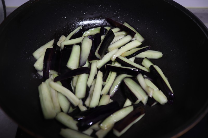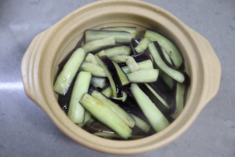 Bước 2: Nhẹ nhàng bóp các miếng cà tím vài lần. Cách làm này sẽ giúp ngăn cà tím bị thâm đen và hấp thụ các gia vị tốt hơn. Tiếp theo làm nóng chảo, cho một chút dầu ăn vào. Khi dầu nóng thì thêm cà tím vào xào trên lửa nhỏ cho đến khi mềm. Lấy cà tím ra khỏi chảo, để vào nồi.