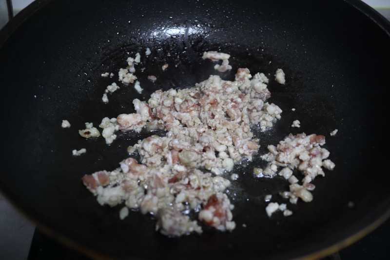 Bước 2: Đặt chảo lên bếp, đun nóng cùng chút dầu ăn. Sau đó bạn cho thịt băm vào xào trên lửa lớn cho đến khi đổi màu. Thêm hành lá và tiếp tục xào rồi nêm vài giọt nước tương đen. Tiếp theo cho bí đao vào tiếp tục xào. Bí đao sẽ tiết ra nước, nên có thể bạn không cần thêm nước. Khi bí đao đã mềm, cho dầu hào và nước tương đen vào, xào đến khi bí đao có màu vàng nâu, sau đó tắt bếp. Nêm muối cho vừa ăn, rồi cho tỏi băm vào đảo đều sau đó lấy ra đĩa.