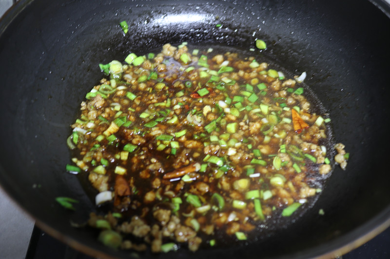 Bước 1: Cắt đậu phụ thành những khối vuông nhỏ. Chuẩn bị một chiếc bát, cho tất cả các nguyên liệu làm nước sốt vào, khấy đều. Rửa sạch và thái nhỏ cây tỏi tươi. Băm nhỏ gừng và tỏi. Đun nóng dầu trong chảo rồi phi thơm gừng và tỏi băm nhỏ. Cho thịt băm vào và xào đến khi thịt tơi ra.