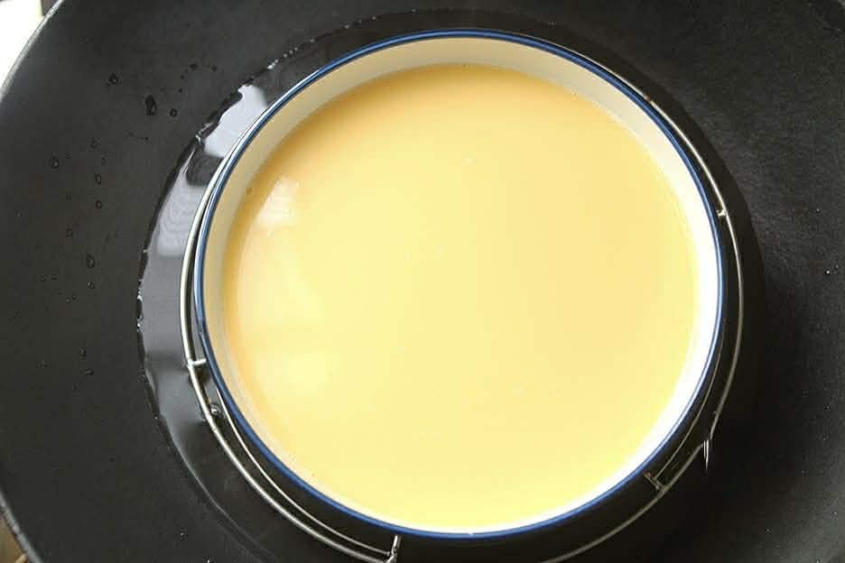 Bước 2: Dùng màng bọc thực phẩm đậy lên đĩa trứng, dùng tăm chọc vài lỗ nhỏ rồi cho nồi hấp. Bật lửa lớn và hấp trong 15 phút sau khi nước sôi. Trong khi chờ hấp trứng, bạn có thể xào thịt băm trong với dầu ăn, thêm nước tương đen để tạo màu và hương vị, rồi để riêng. Nếu thịt đã được ướp kỹ thì không cần thêm gia vị. Nếu bạn thích thịt băm có màu nhạt hơn, hãy kiểm soát lượt nước tương đen cho vào. Khi phần trứng hấp đã đông lại, cho thịt băm và rưới một chút nước tương vào, rắc hành lá thái nhỏ lên trên, đậy nắp và hấp thêm 1phút nữa là hoàn thành.