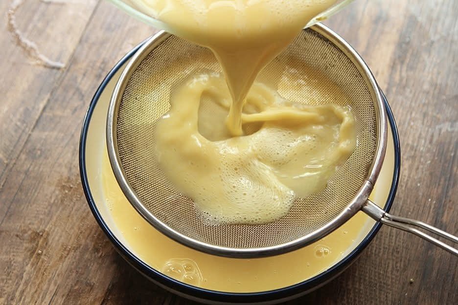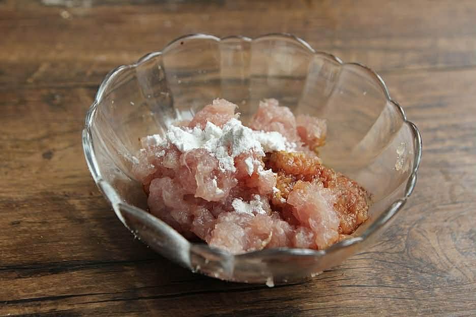 Bước 1: Thịt băm bạn cho vào bát, thêm chút muối, nước tương và bột bắp, trộn đều rồi ướp trong 15 phút. Đánh tan trứng, đổ nước vào hỗn hợp trứng, lượng nước nên gấp đôi lượng trứng, sau đó thêm nửa thìa cà phê muối, và nhẹ nhàng khuấy đều. Sau đó bạn lọc hỗn hợp trứng qua rây vào đĩa hấp. Vớt bỏ hết lớp bọt nổi lên và để yên. Điều này sẽ giúp món trứng hấp được mịn màng hơn.