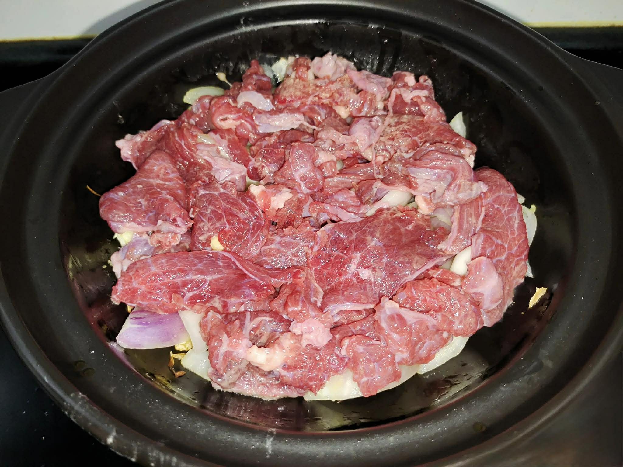 Bước 3: Món ăn này sẽ được nấu bằng nồi đất nung để giữ nhiệt và giúp hương vị món ăn ngon hơn. Đầu tiên bạn cần lau khô nồi đất, sau đó cho một chút dầu ăn vào, đun nóng. Tiếp theo, cho hành tây thái miếng, gừng băm nhỏ và tỏi băm nhỏ vào xào thơm. Sau đó, vặn nhỏ lửa, dàn đều hành tây ra rồi lấy thịt bò đã ướp ra và rải đều lên trên. Đậy nắp nồi và đun trên lửa nhỏ trong khoảng 2-3 phút cho đến khi thịt bò hơi đổi màu.