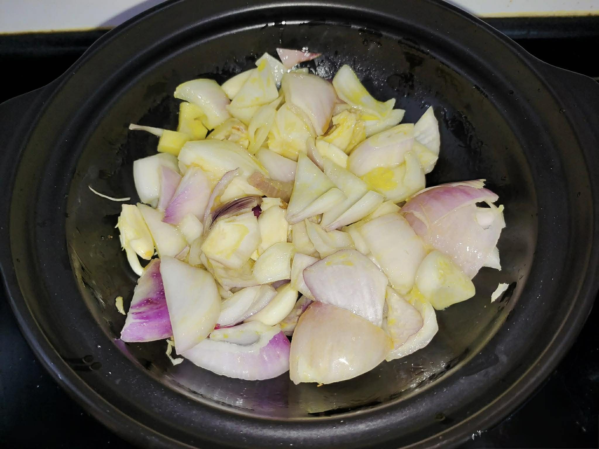 Không cần thêm nước khi hầm trong nồi đất, vì hành tây và ngao sẽ tiết ra rất nhiều nước, nên không cần lo lắng về việc món ăn bị khô.