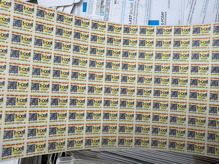 Tem chống hàng giả được nhóm người dán lên các sản phẩm mỹ phẩm giả nhằm lừa dối khách hàng. (Ảnh: Công an Quảng Trị)